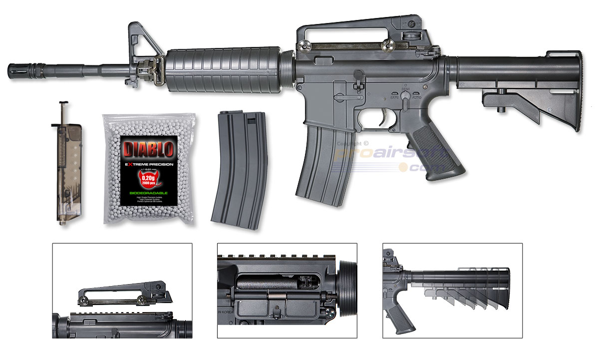 Ladataan tiedostolistaa...Proairsoft M4A1 on jousitoiminen rynnäkkökivääri, joka on varustettu lineaarisesti säädettävällä hopilla. Näet heti missä asennossa hoppi on ja sitä on helppo myös säätää. Aseessa on säädettävä 4-asentoinen teleskooppitukki ja irrotettava kantokahva, jonka alla on metallinen tähtäinkisko optisia tähtäimiä varten. Takatähtäin on säädettävissä sekä pysty- että vaakasuunnassa.
