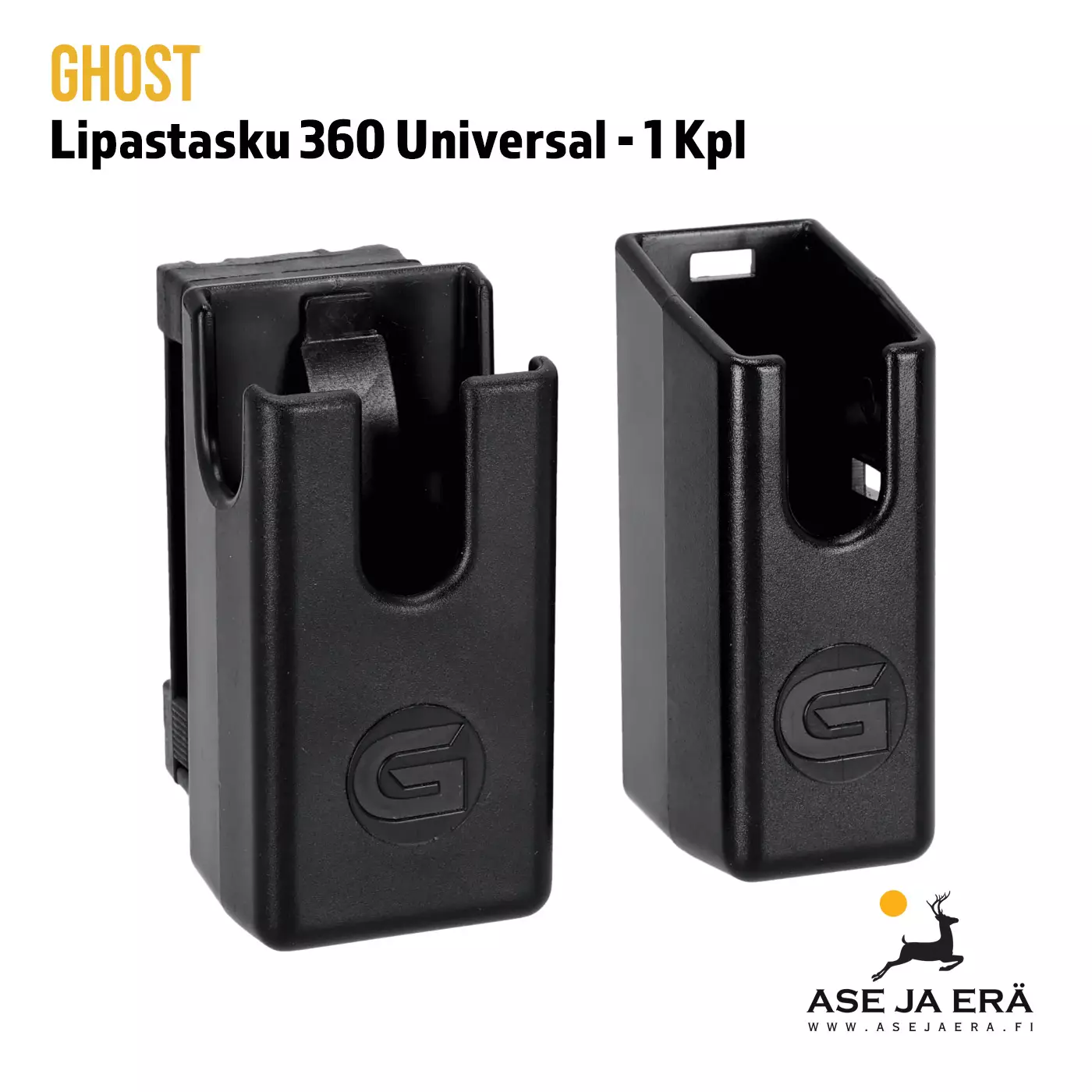 D-clip pikakiinnitys avautuu sivuvivuista, joten kotelon asennus ja irrotus onnistuu ilman vyön purkamista. Kääntyvä rakenne tarjoaa täyden 360 asteen kulmasäädön, jolloin lippaanvaihto-ote ja kantosuunta voidaan optimoida lajiin ja ampujan tekniikkaan.