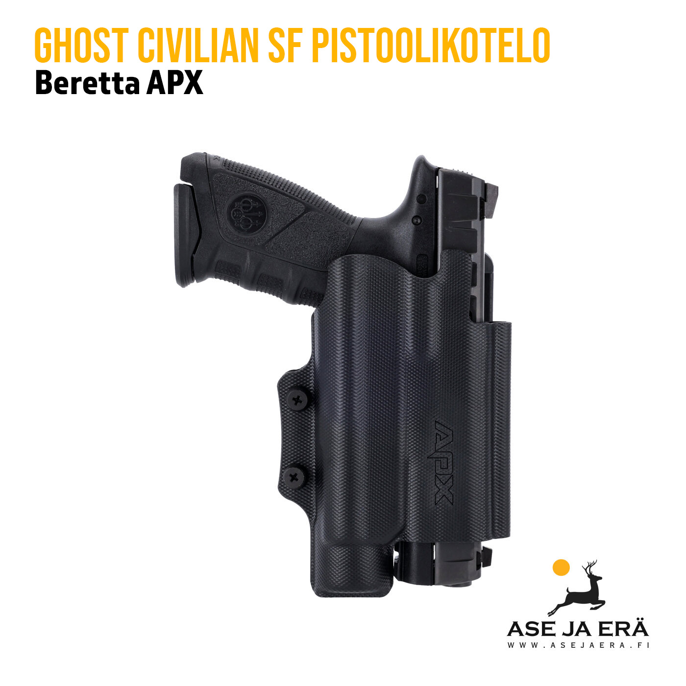 Ghost Civilian SF holster pistoolikotelo on suunniteltu mahdollistamaan aseen lisävalaisimen käytön. Kotelo on yhteensopiva TRL1-, X200- ja X300 -asevalojen kanssa. Teknopolymeeristä valmistettu pistoolikotelo on kevyt ja kestävä, ja se on suunniteltu maksimoimaan mukavuus ja suoja piilotetun kantamisen aikana. Sopii ihanteellisesti viranomaisille ja urheiluammuntaan, sillä se täyttää tiukat vaatimukset ja tarjoaa erinomaisen vakauden aseen käyttötilanteessa.
