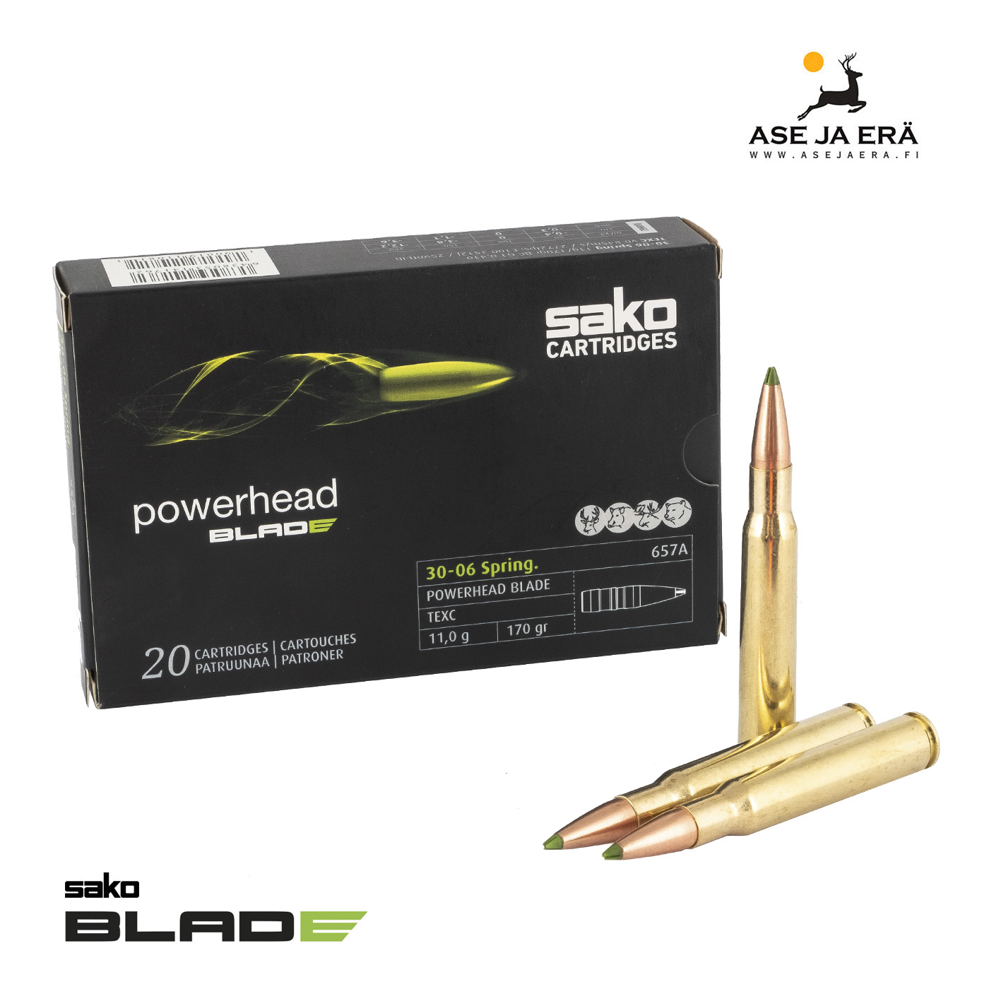Sako Powerhead Blade patruunat on varustettu Sakon uudella polymeerikärkisellä kupariluodilla. Blade luoti on valmistettu 100% kuparista ja sen 5-vaiheinen rakenne takaa hallitun laajanemisen myös pitkillä etäisyyksillä, sekä heikommalla iskuvoimalla.