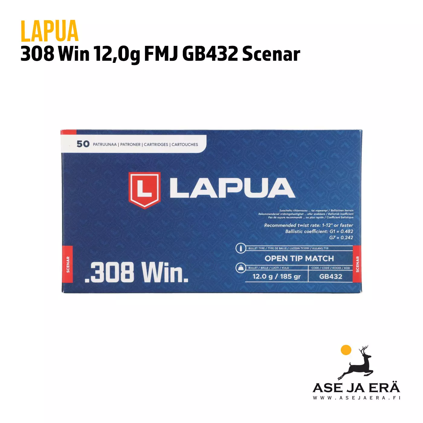 Tämä patruuna soveltuu aseisiin kaliiperilla .308 Win. Lapua-patruuna on suunniteltu vastaamaan sekä aloittelijoiden että kokeneiden ampujien tarpeisiin ampumaharrastukseen. Lisää vaihtoehtoja tällä kaliiperilla alakategoriasta “308 kaliiperi”. Tämänkin patruunan valmistusmaa Suomi.