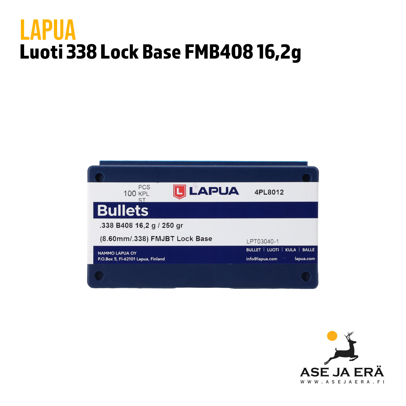 338 Lapua Lock Base B408 FMJBT on suunniteltu eritoten jälleenlataamiseen. Sen 16,2g paino ja ominaisuudet tarjoavat tarkan ja tehokkaan suorituskyvyn, olitpa sitten kokenut ampuja tai uusi harrastaja Pakattu käytännöllisesti 100 kpl eriin, nämä luodit ovat oivallinen valinta niille, jotka haluavat nauttia harrastuksesta. Oikean luodin valinnassa on hyvä huomioida, että kokovaippaluoti soveltuu ratakäyttöön, harjoitteluun sekä linnustukseen, kun taas puolivaippaluoti esimerkiksi kauriin, peuran, hirven tai karhun metsästykseen.