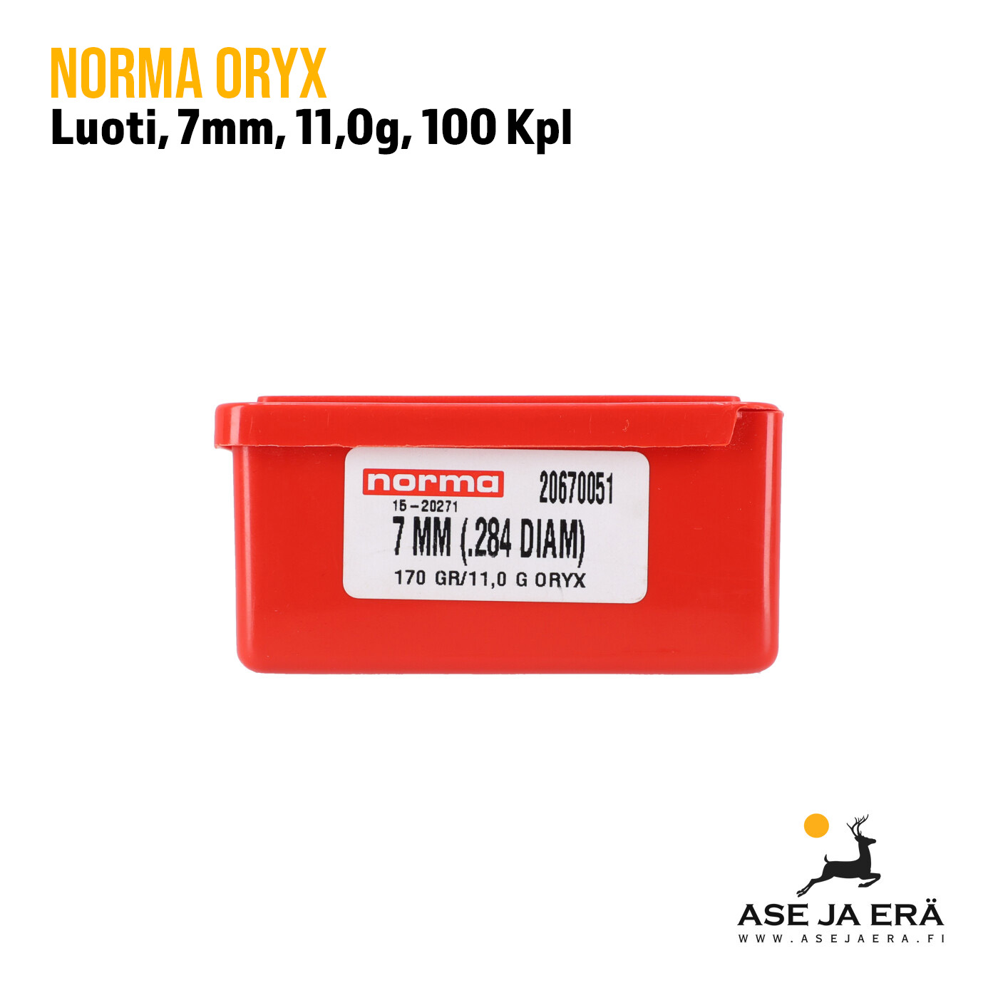 7mm (.284) 170gr Norma Oryx luoti on erinomainen valinta ladatessa patruunaa hirvi- tai peurametsälle. Luodin paino 170gr / 11g. Paketissa 100kpl luoteja.