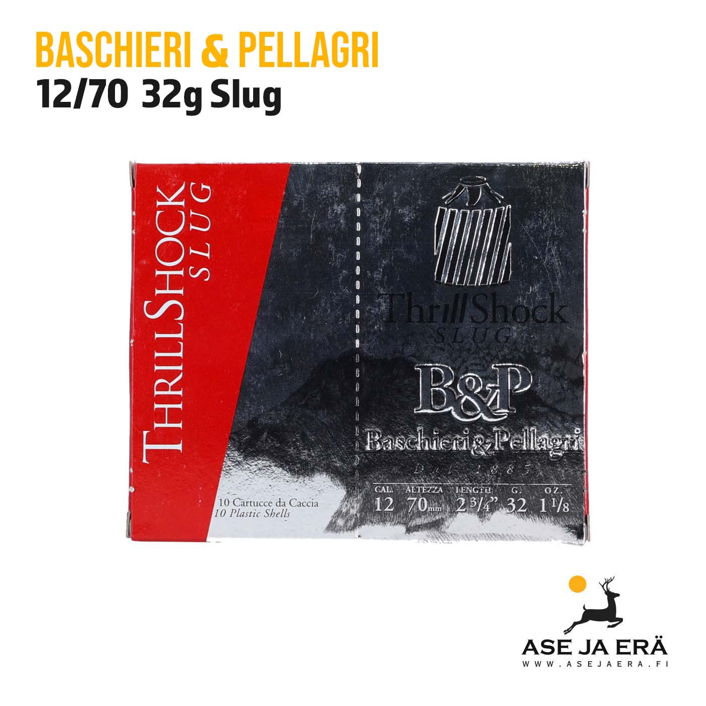 B&P Thrill Shock Slug 12/70 32g on äärimmäisen tehokas haulikon täyteinen. 32 gramman täyteisen lähtönopeus on jopa 500m/s, mikä takaa suuren pysäytysvoiman.