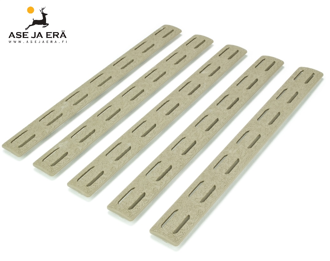 Voit leikata paneelinauhan haluamasi mittaiseksi. Ne ovat kaksisuuntaisia, eli niissä ei ole etu- ja takaosaa, joten ne on helppo napsauttaa vain paikalleen. BCM Gunfighter M-LOK -kiskopaneelit on ventiloitu piipun jäähdyttämiseksi. Yksi setti sisältää 5 paneelinauhaa.