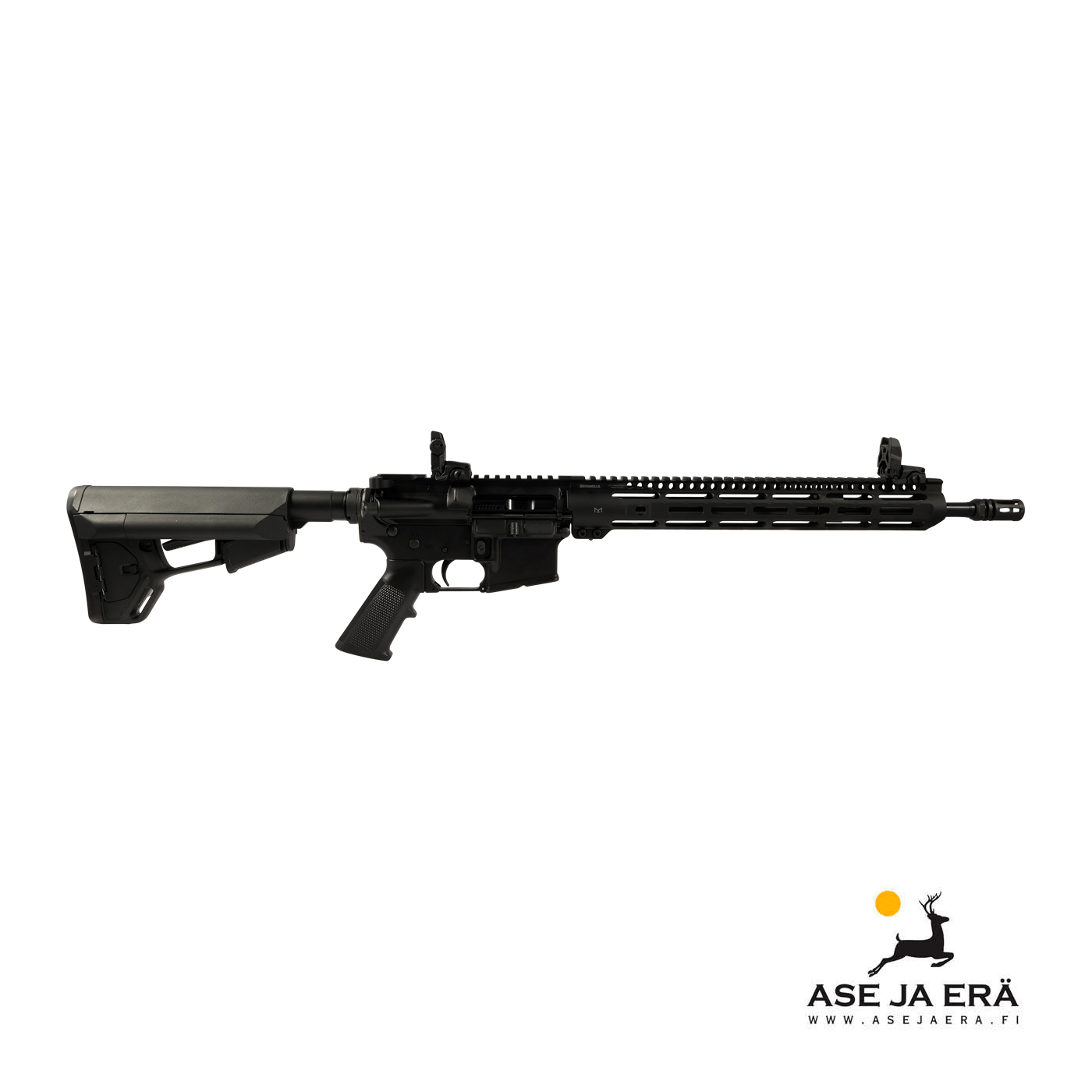 Brownells AR-15 OEM -kivääriin on lisätty Magpul AR-15 ACS Mil-Spec -tukki, Brownells AR-15 Wrenchman LW 14" -kädensija ja säädettävä Magpul MBUS Back-Up -tähtäinsetti. Siitä löytyy siis kaikki oleellinen, joten saat valmiiksi kasatun aseen kätevästi tästä paketista.
