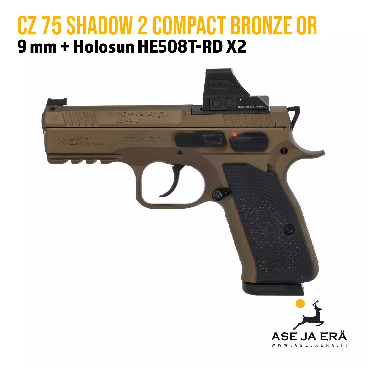 CZ 75 Shadow 2 Compact Bronze 9x19 pistooli + Holosan punapistetähtäin on ainutlaatuinen Limited Edition -pistooli, joka erottuu tyylikkäällä pronssinvärisellä cerakote-pinnoituksellaan ja mustilla yksityiskohdillaan.