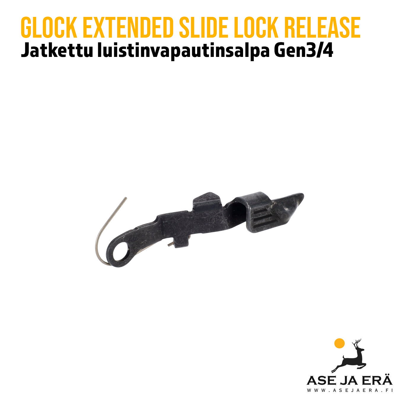 Jatkettu Extended Slide Stop Release (7496) luistinvapautinsalpa Glockiin.Sopii: G17/G19/G22/G23/G26/G27/G31/G32/G33 ja G35 pistoolien Gen3 ja Gen4 malleihin.