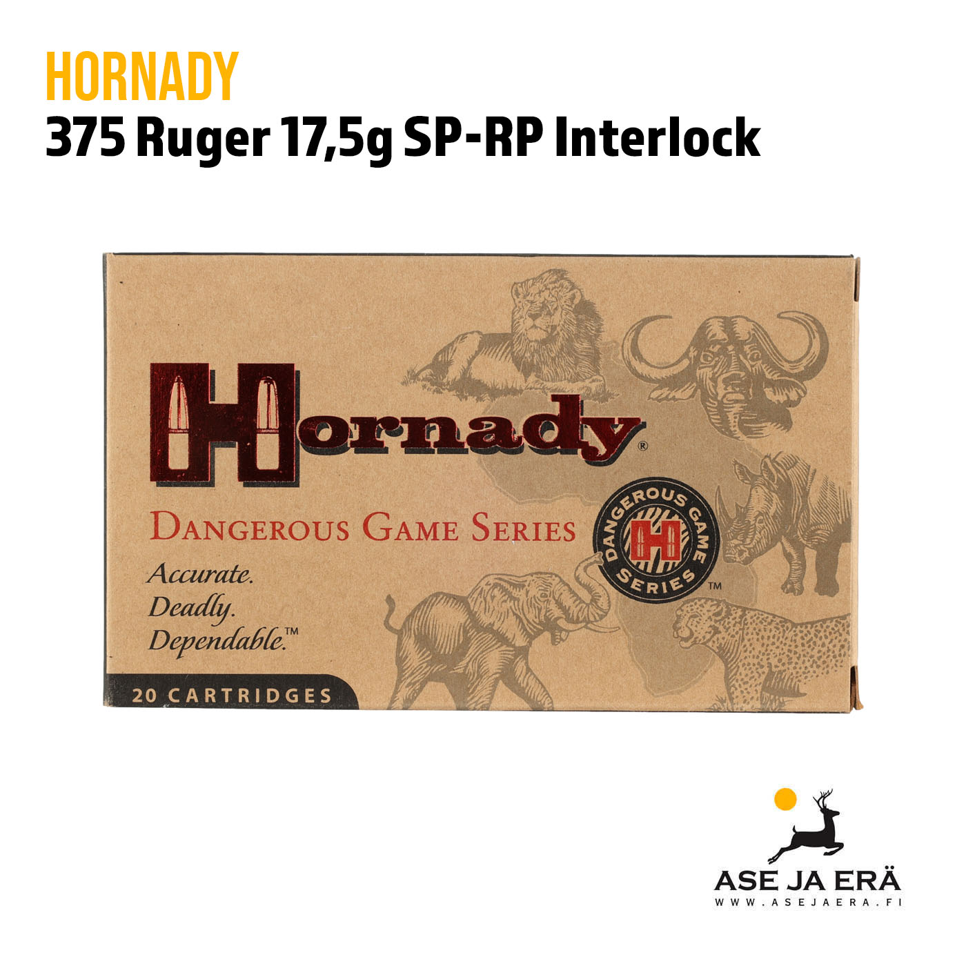 Hornady valmistaa jokaisen Dangerous Game™ sarjaan kuuluvan patruunan vain parhaista saatavilla olevista komponenteista. Heidän ainutlaatuiset tekniikkansa ja prosessinsa kilpailevat jopa käsin lataus tekniikoiden ja prosessien kanssa. Mikä tekee tästä patruunasta loistavan valinnan jokaiselle metsästäjälle, joka haluaa ammuksiltaan huippuluokan suorituskykyä.
