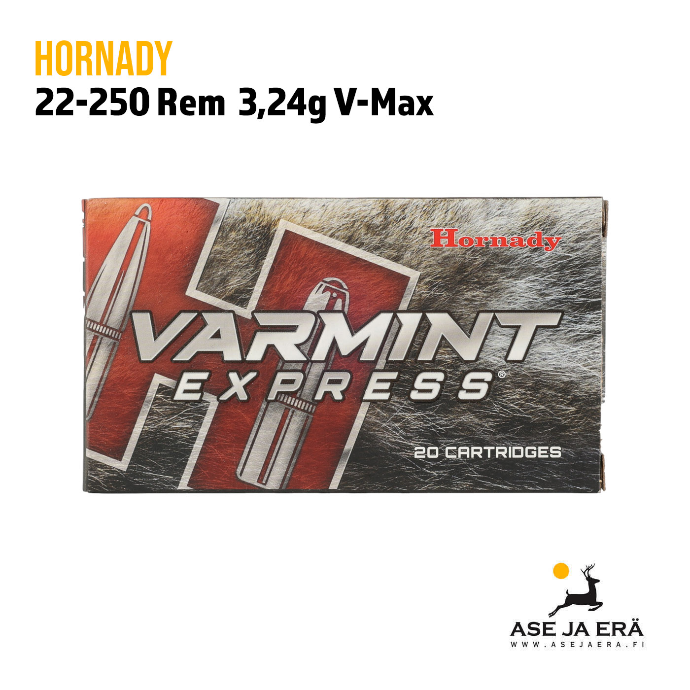 Hornady Varmint Express® 22-250 Rem 3,24g V-MAX -patruunat ovat täydellinen valinta niille, jotka vaativat kivääriltään luotettavaa ja kovaa suorituskykyä. V-MAX®-luodin muotoilussa yhdistyvät match-luokan tarkkuus ja tuhoisan tehokas nopeasti sirpaloituva rakenne, joka takaa maksimaalisen energiansiirron osumahetkellä.