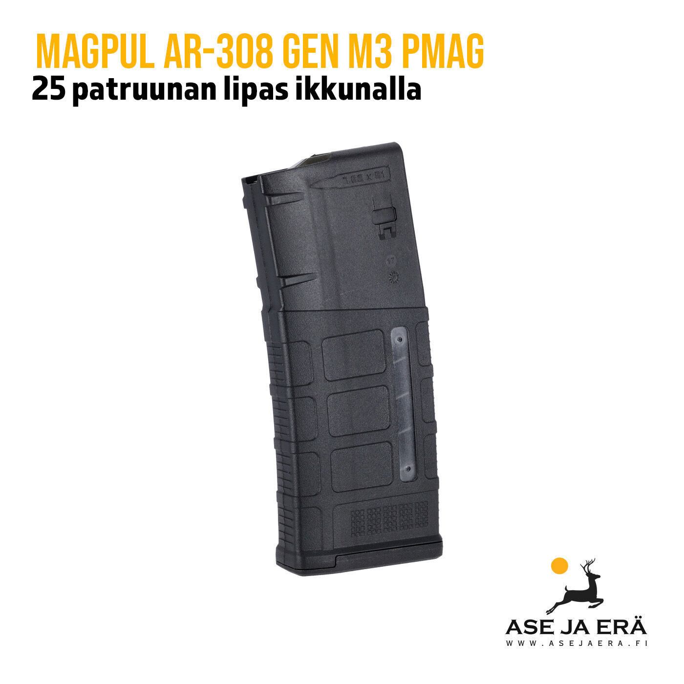 Kevyt Magpul AR-308 GEN M3 PMAG polymeeri lipas ikkunalla ja 25 patruunan kapasiteetilla SR-25/M110 yhteensopiviin kivääreihin.