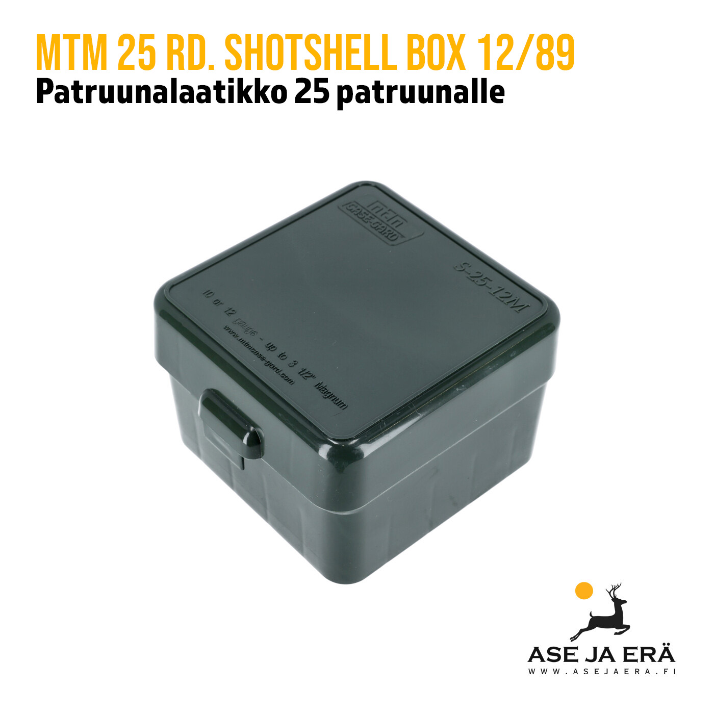 MTM S25-12M-11 on patruunarasia, johon mahtuu 25 kappaletta maksimissaan 3,5" pitkiä 12/89 tai 10/89 haulikon patruunoita hylsynkanta ylöspäin.