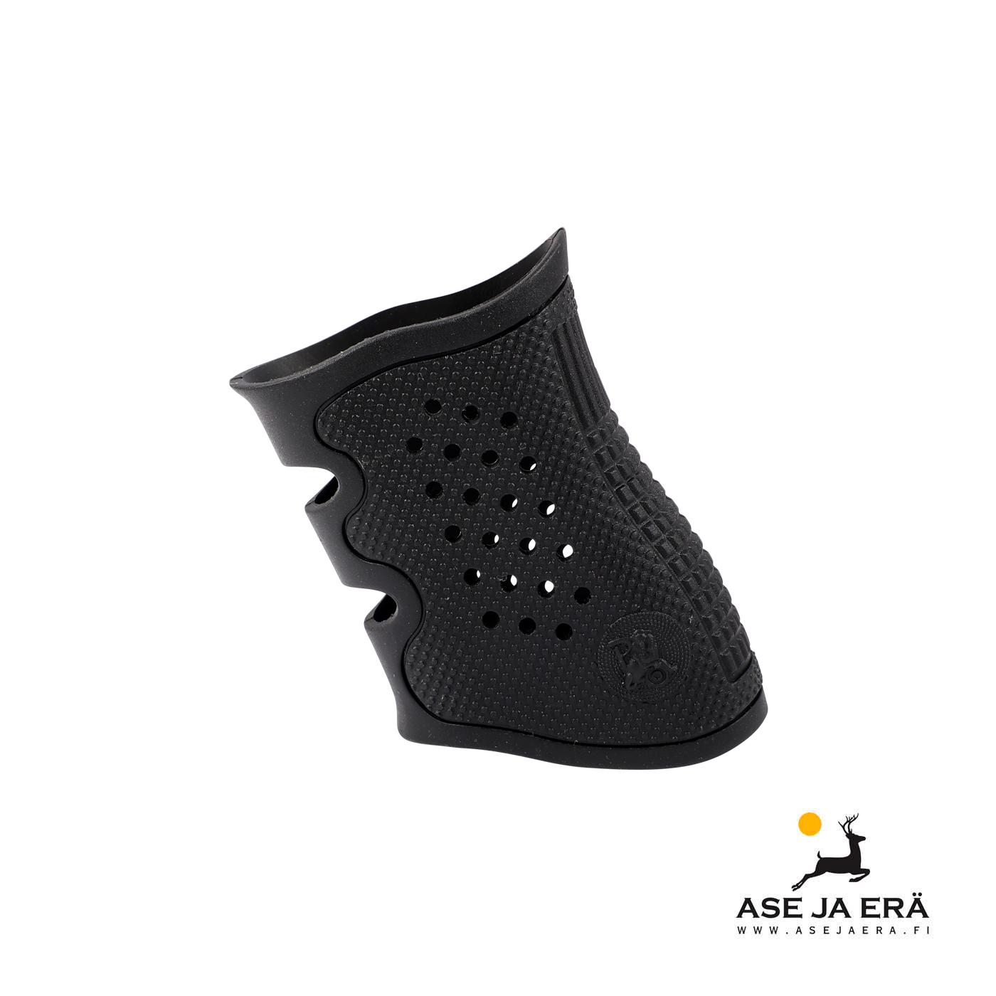 Rekyyliä vaimentava kumigrippi. Grippi on helppo vetää kahvan päälle ja se pysyy käytössä tukevasti paikoillaan.