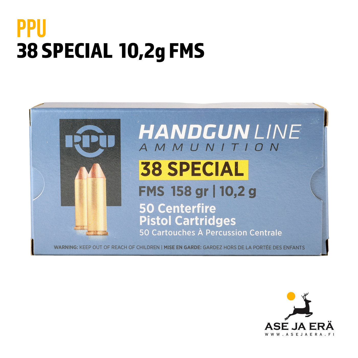 PPU 38 Special 10,2g FMS revolveripatruuna harjoitteluun. Tämän patruunan luoti on kokovaippainen, teräväkärkinen (FMS) tarkoittaen että luodin ulkokuoren sisällä on lyijysydän. Kokovaippainen luoti jättää piipun puhtaammaksi, kuin vanhanaikainen lyijyluoti. PPU:n patruunat valmistetaan moderneilla menetelmillä, taaten luotettavuuden ja tasalaatuisuuden.