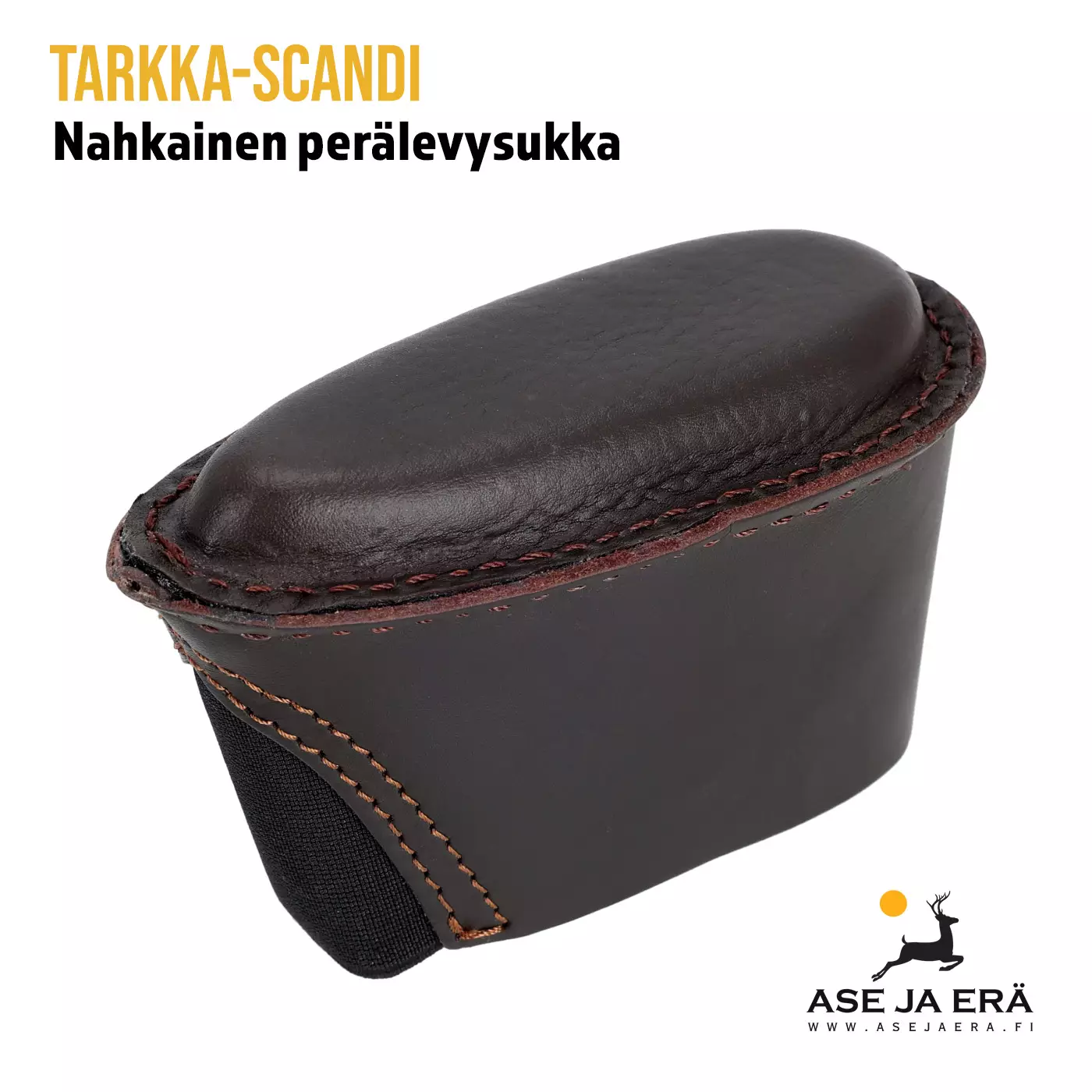 Tarkka-Scandi nahkainen perälevysukka on siisti ja käytännöllinen ratkaisu vetopituuden hienosäätöön sekä laukaisun hallinnan parantamiseen. Pehmuste vaimentaa rekyylin tuntua, nahkapinta tuo varmaa pitoa ja klassisen ulkonäön.