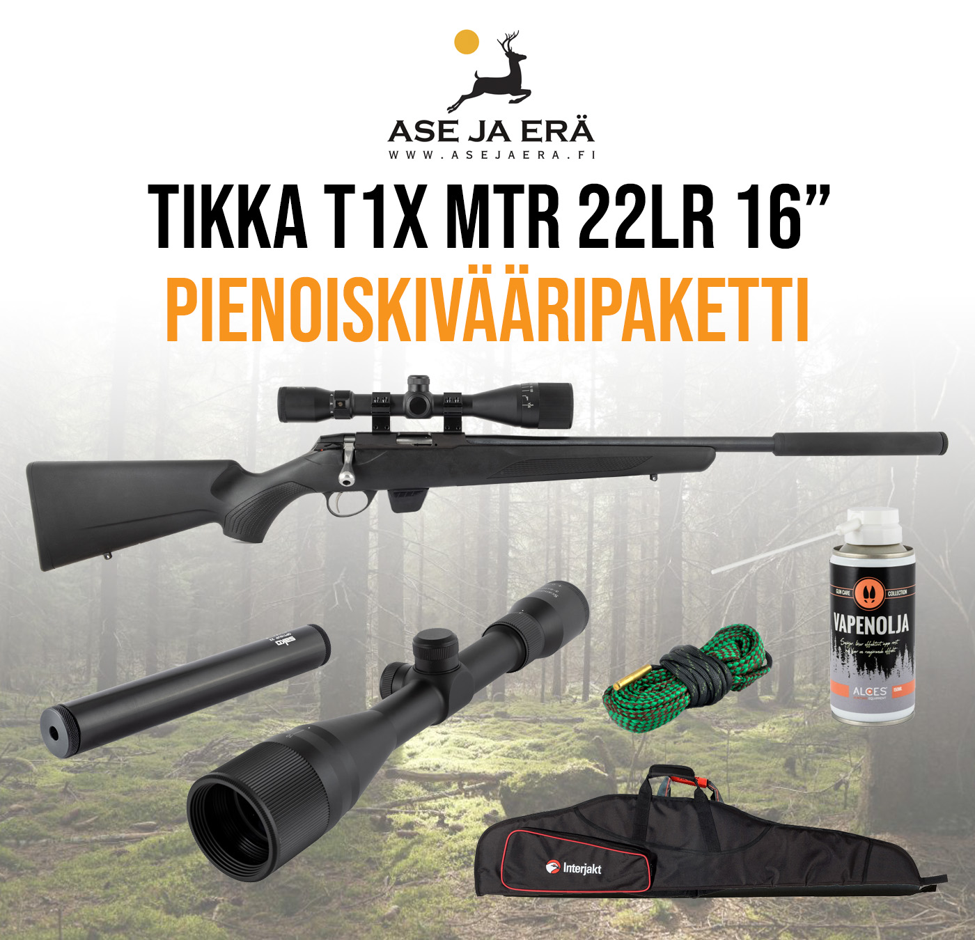 Tikka T1x 22LR pienoiskivääripaketti on kasattu huippusuositun kotimaisen Tikka T1x 22LR 16" pienoiskiväärin ympärille. Pienoiskiväärin lisäksi paketti sisältää Scandium C22 3-9x40 AO kiikaritähtäimen, AseUtra ECO äänenvaimentajan, asepussin sekä puhdistusnarun ja aseöljyn.