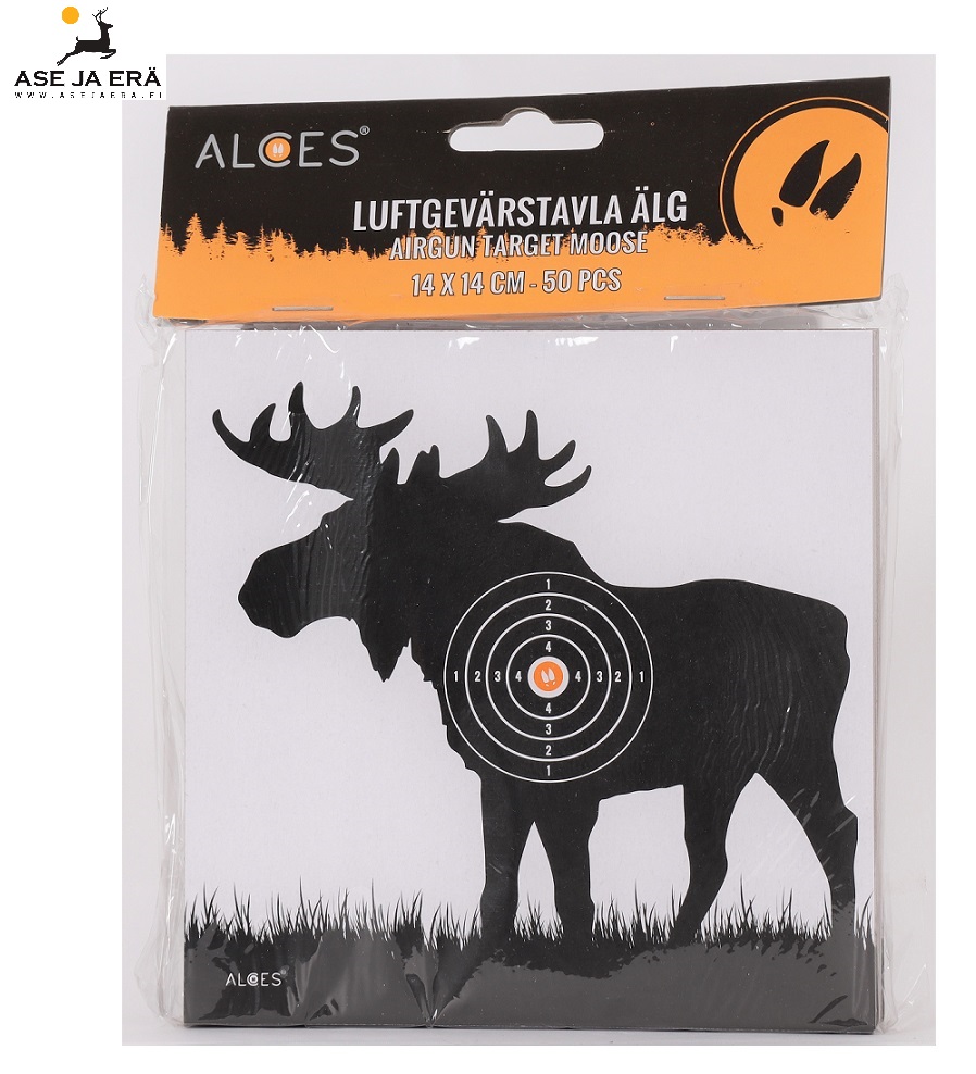 Alces Ilmakivääritaulu Hirvi on 14x14 cm kokoinen maalitaulu ilmakivääriammuntaan. Paketissa on 50 kappaletta tauluja.