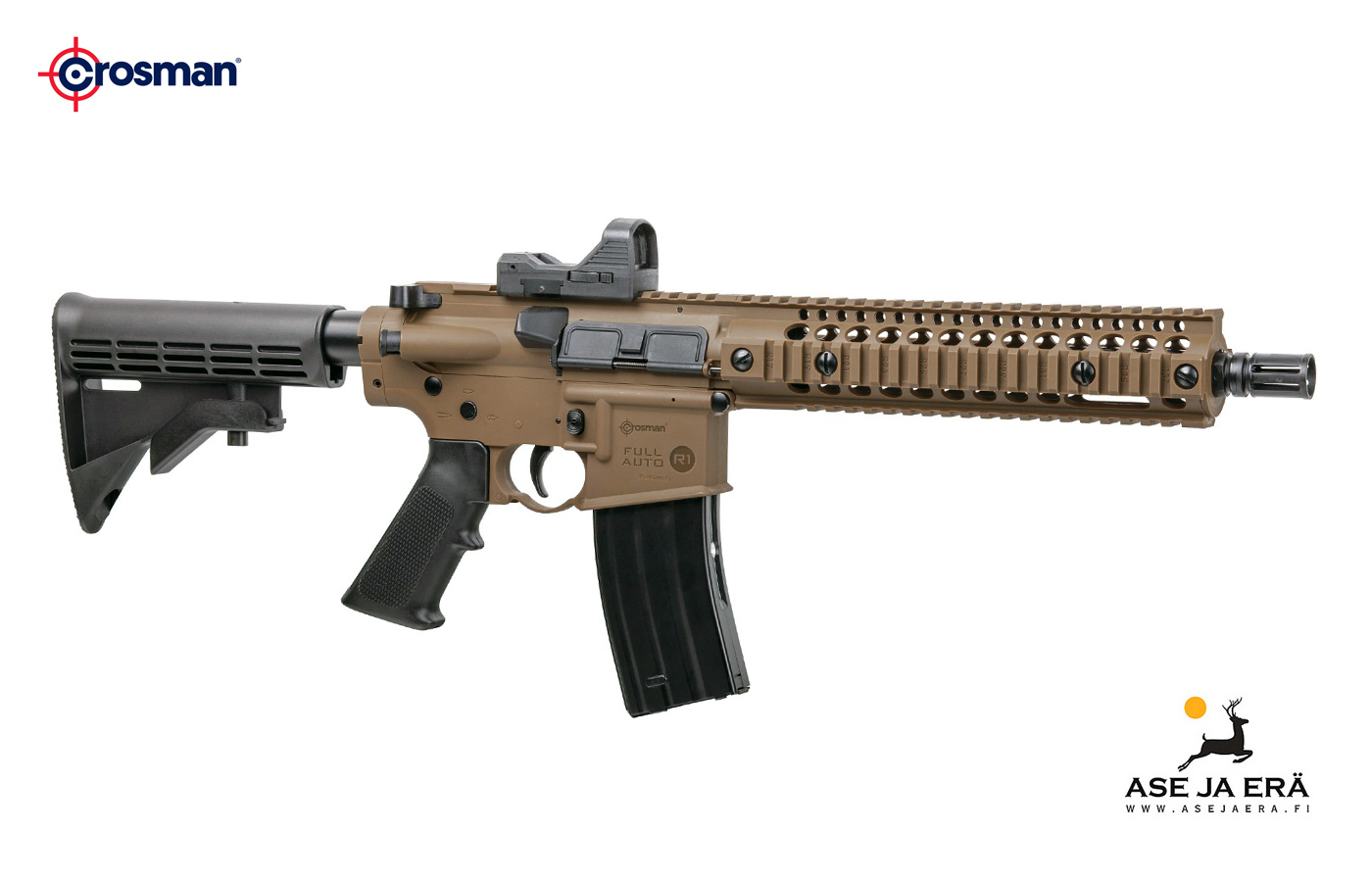 Ladataan tiedostolistaa... Crosman R1 Full Auto Sarjatulella varustettu ilmakivääri jatkaa Crosman DPMS SBR ja MPW M4 Bushmaster -mallien viitoittamaa linjaa.