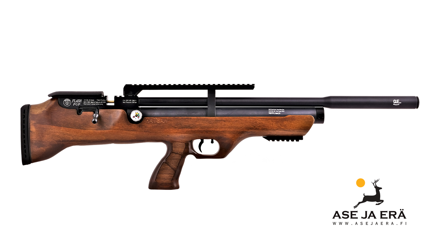 Hatsan Flashpup pakkaa isompien PCP paineilmakiväärien ominaisuudet kompaktiin, helposti liikuteltavaan sekä käsiteltävään muotoon. 165cl paineilmasäiliö on sijoitettu molempikätiseen, pistoolikahvalla, sekä säädettävällä poskipakalla varustettuun puiseen Bullpup tukkiin.