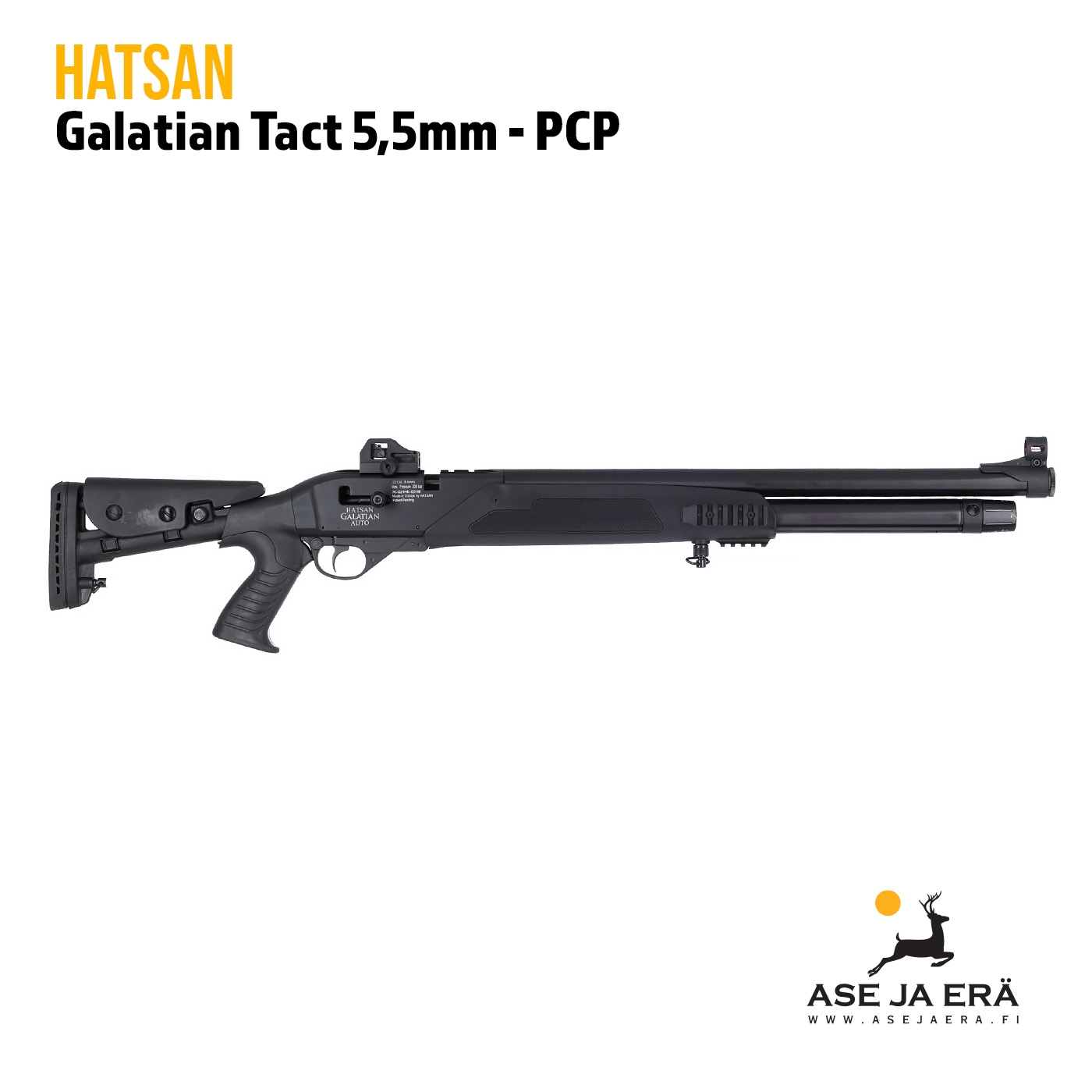 Hatsanin PCP-ilmakiväärien lippulaivamalli Galatian uusin päivitys tarjoaa taattua tehoa erinomaisin säätömahdollisuuksin. Päivitetty synteettinen tukki on ergonomisesti muotoiltu ja sen säädettävä poskipakka sekä säädettävä ja irrotettava teleskooppiperä takaa hyvän ampuma-asennon.