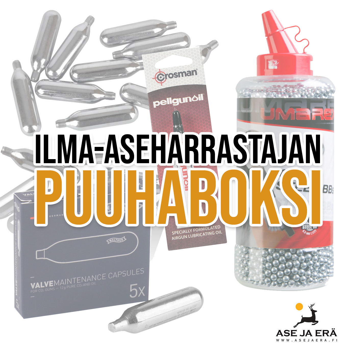 "Puuhaboksin" mukana toimitetaan reilu määrä CO2-kapseleita, BB-teräskuulaa ja ilma-aseen huoltoon tarvittavat voiteluaineet.