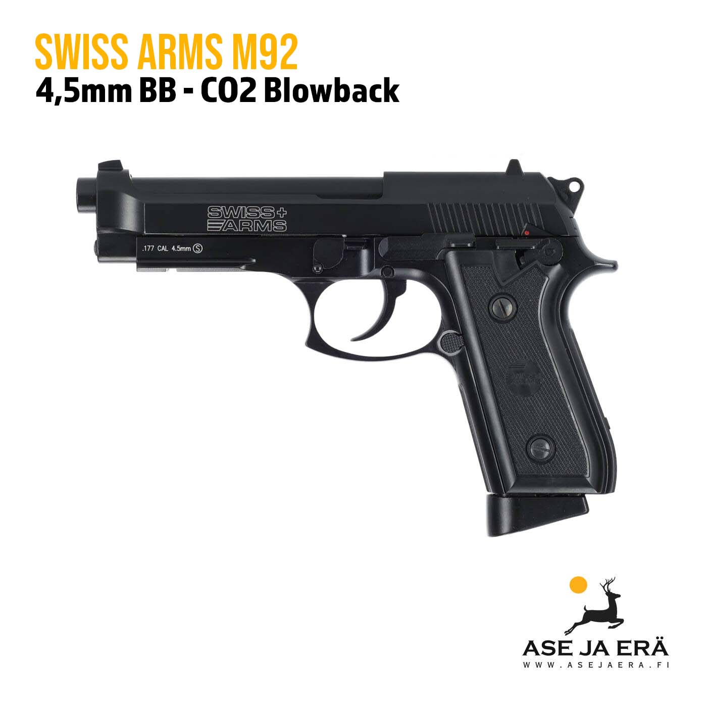 Ladataan tiedostolistaa...Swiss Arms M92 on blowback ominaisuudella varustettu täysmetallirunkoinen CO2 ilmapistooli 4.5mm kuulille.