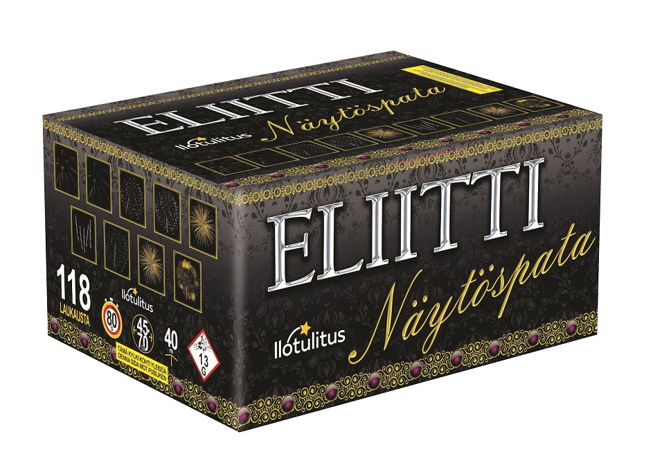 Eliitti näytöspata on kerrassaan loistelias 118 laukauksen monitoimipata. Tämä on nähtävä! Nousukorkeus: 40m Efektin halkaisija: 45-70m Kesto: 80s