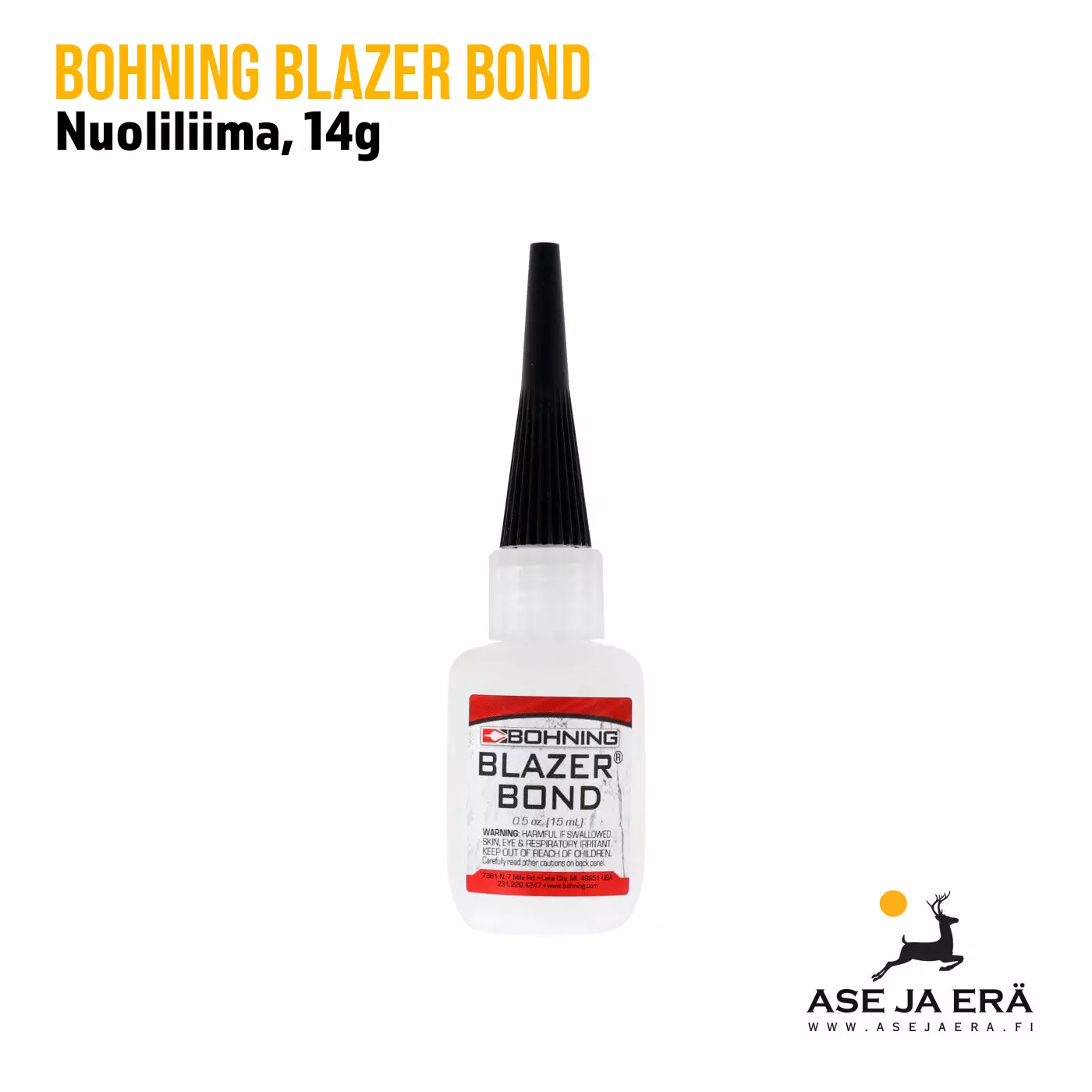 Bohning Blazer Bond on erittäin vahva pikaliima sulkien, glue-in taulukärkien, inserttien ja nokkien kiinnitykseen. Tarttuu kaikkiin nuoliputkimateriaaleihin. Kuivumisaika 20 sekuntia ja kovettumisaika 2h. Toimii myös kosteissa olosuhteissa. Kaksi pakkauskokoa: 14g (15ml) ja 28g (30ml).