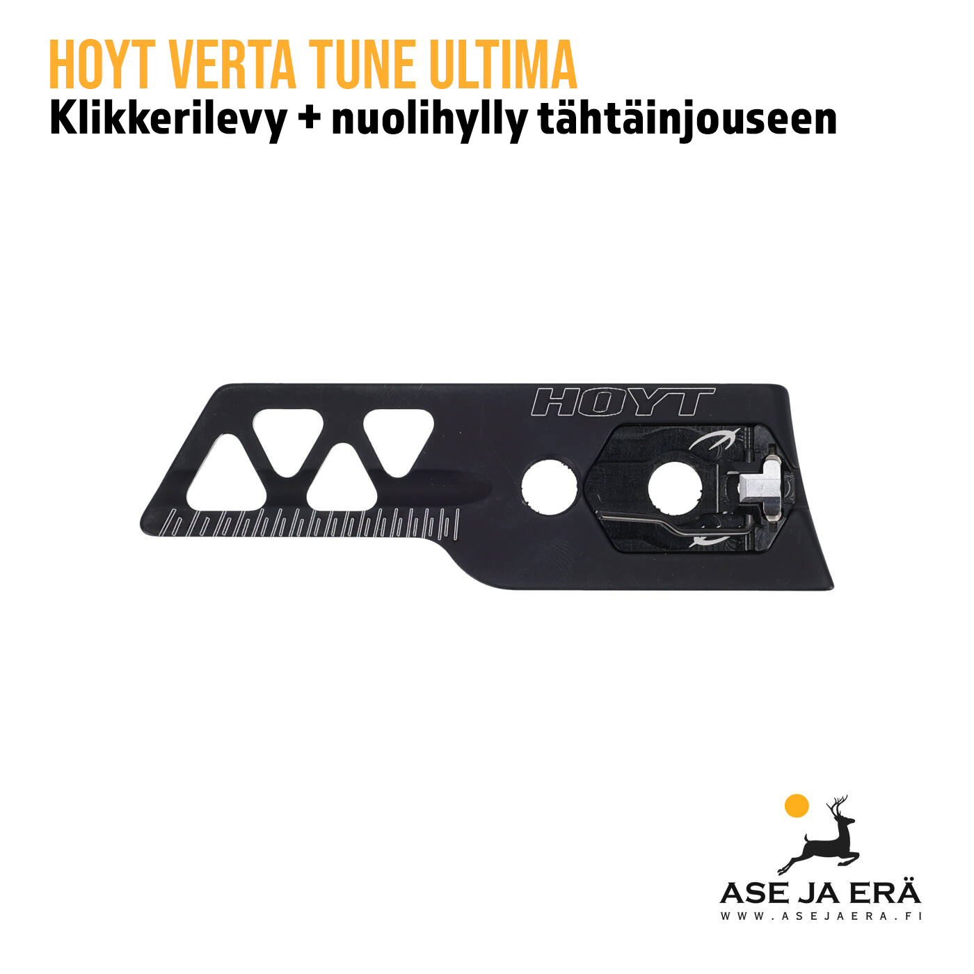 Klikkerilevy on varustettu laser-kaiverruksilla, joiden avulla klikkerin asentaminen on helppoa. Pakkaus sisältää Hoyt Verta Tune klikkerilevyn sekä integroidun Shibuya Ultima nuolihyllyn.