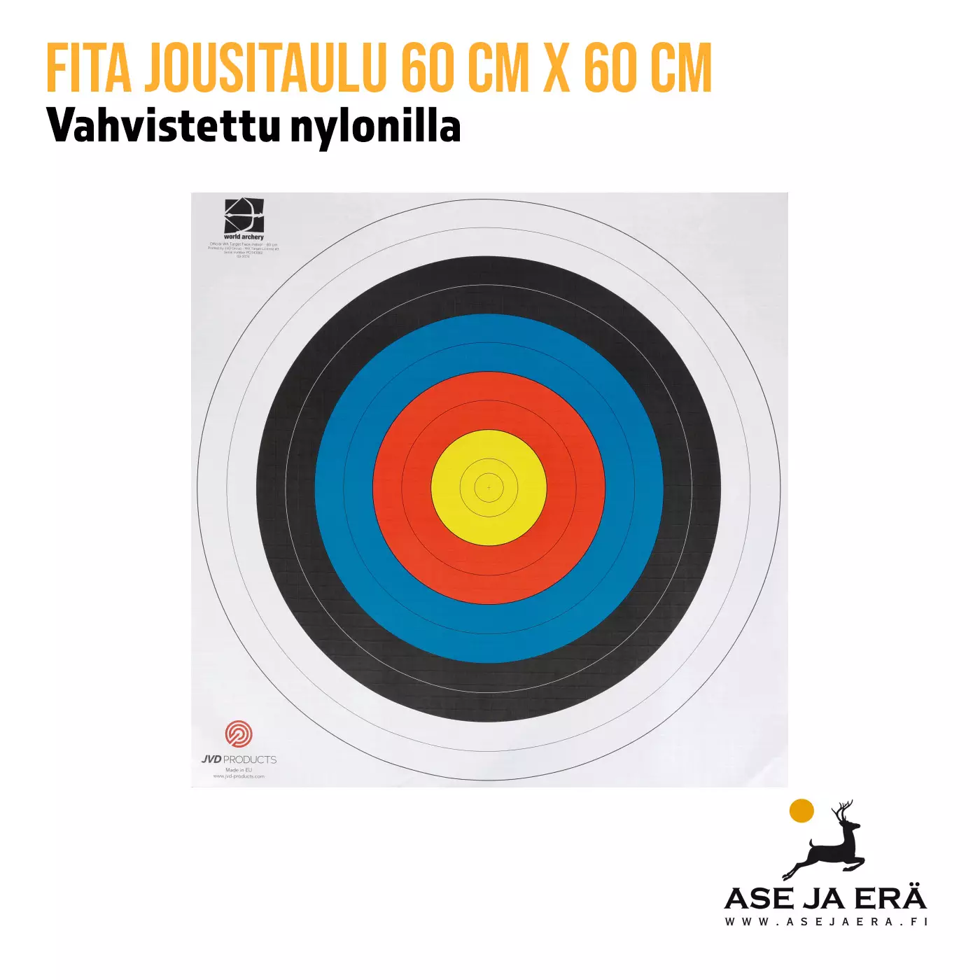 JVD on tunnettu laadukkaista maalitauluistaan, joita käytetään ammattitason turnauksissa ympäri maailman. FITA/WA-taulut ovat vakiovalinta jousiampujille, jotka arvostavat virallisia mittoja ja virheetöntä pistealuetta. Tauluista löytyvät selkeät 1–10 pisteen alueet sekä sisin X-renkaan merkintä, joka sopii kaikille jousityypeille.