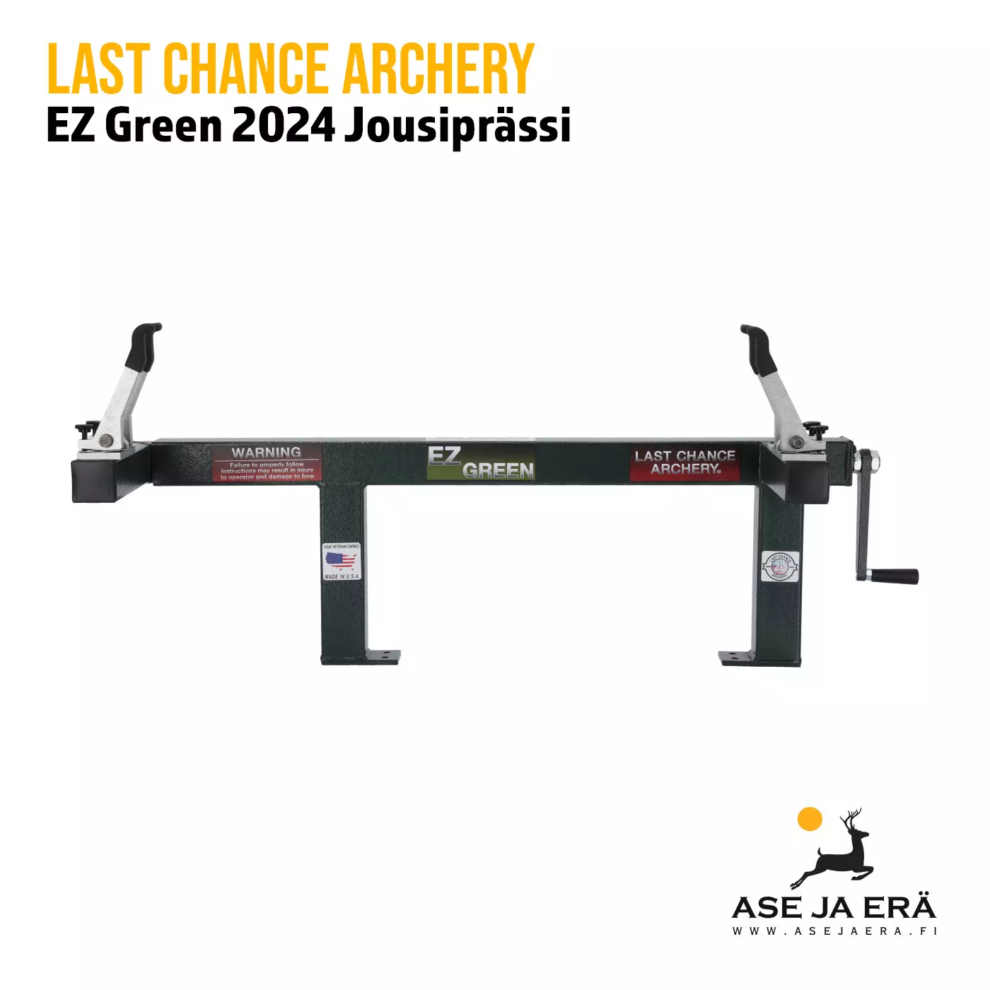 Last Chance Archery EZ Green jousiprässi on täydellinen valinta taljajousen prässäämiseen. Se soveltuu niin kotikäyttöön kuin esimerkiksi jousiammuntaseuran luottotyökaluksi. Se on suunniteltu tukemaan useimpia nykyisiä taljajousia ja tarjoaa turvallisen tavan käsitellä jousia. EZ Green -malli on varustettu patentoidulla sormijärjestelmällä, joka mahdollistaa tarkan ja hellävaraisen puristuksen ilman vääntöä jousen runkoon. Käsikammen ansiosta prässin käyttö on nopeaa ja vaivatonta. Tämä malli on rakennettu kestävistä materiaaleista ja viimeistelty vihreällä, naarmuuntumattomalla jauhemaalipinnalla, joka kestää kovaa käyttöä. Tässä uudessa EZ Green 2024 jousiprässissä aina vakiona leveät 3" kiinnityskappaleet, joiden ansiosta prässin kynsien leveys soveltuu nykyaikaisille leveälapaisille taljajousille.