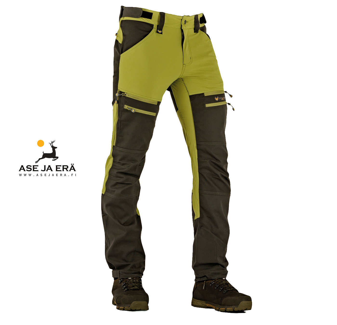 Kestävästä ja joustavasta materiaalista valmistetut Haunter Vännas housut ovat erinomainen valinta niin ulkoiluun, kalastukseen kuin metsästykseen. Housujen korkeassa vyötärössä on tarralliset säätötampit sekä vyölenkit. Avoimien perustaskujen lisäksi housuissa on neljä vetoketjullista etutaskua sekä vetoketjulliset takataskut. Housujen sivuissa on vetoketjulliset tuuletusaukot. Lahkeiden suut on varustettu kuminauhan lisäksi neppareilla varmistetulla säädöllä sekä piilotetuilla kenkäkoukuilla, joilla lahkeet voidaan varmistaa kenkiin.
