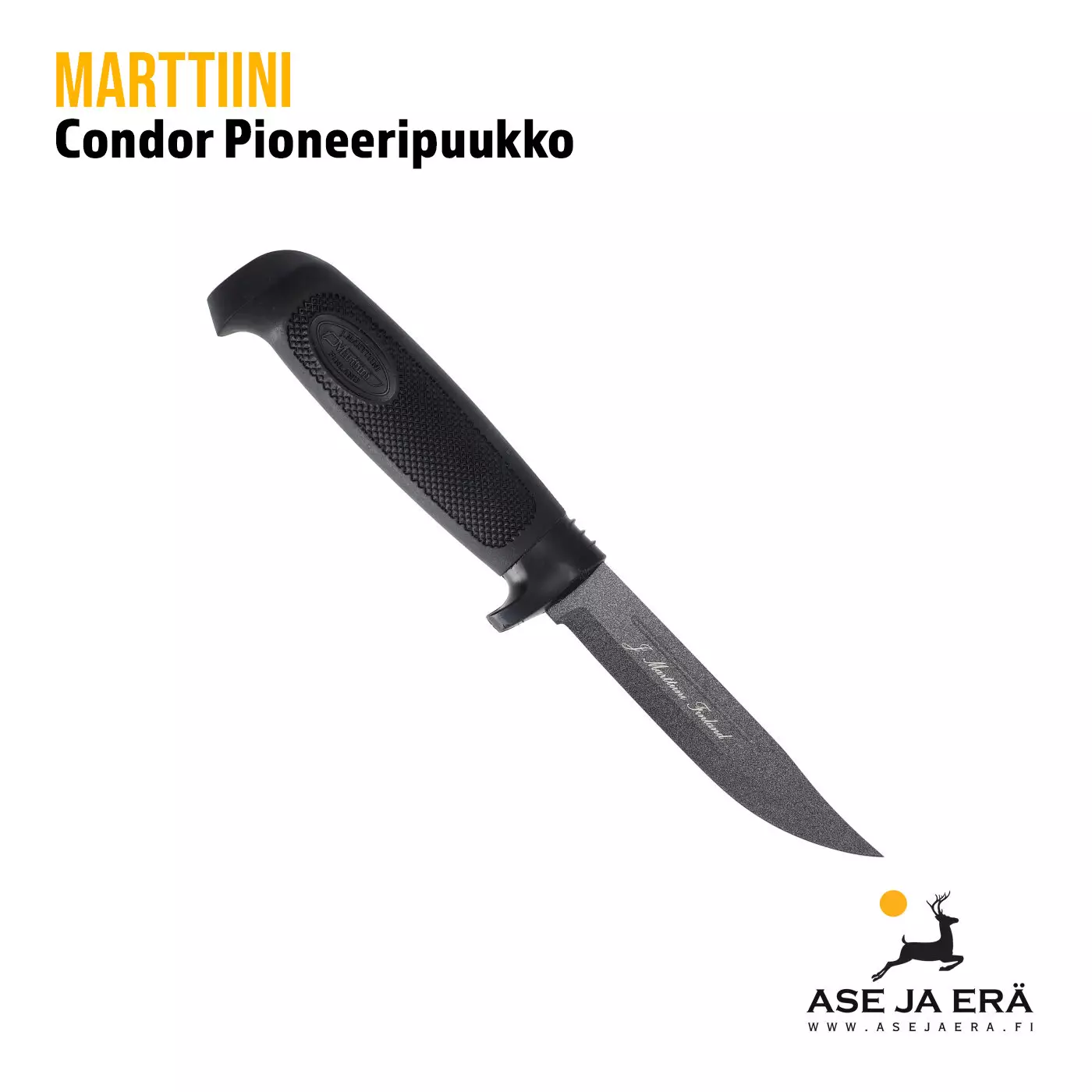 Marttiini Condor Pioneeripuukko on kehitetty jokapäiväiseen käyttöön aktiivisille retkeilijöille, ulkoilijoille ja eränkävijöille. Tämä "Sissipuukon pikkuveli" yhdistää järkevät materiaalit ja käytännöllisyyden: terä on valmistettu helppohoitoisesta ruostumattomasta kromiteräksestä, jonka kätevä Martef-pinnoite tekee pinnasta erittäin liukkaan ja helpottaa puhdistusta sekä käyttöä. Pinnoite suojaa terää korroosiolta sekä kulumiselta, ja pitää huollon vaivattomana. Kuminen musta kahva mahdollistaa pitävän ja miellyttävän otteen säässä kuin säässä - ajaen asiansa niin arjessa kuin erämaassakin. Kokomusta nahkatuppi viimeistelee kokonaisuuden, tarjoten suojaa ja tyylikkyyttä. Kompakti koko tekee Pioneeripuukosta näppärän valinnan mukaan otettavaksi niin metsälle, kalalle kuin retkellekin. Suomalainen Marttiini tunnetaan laadukkaasta puukkoperinteestä, joten voit luottaa puukon kestävän ja toimivan luotettavasti vuodesta toiseen.