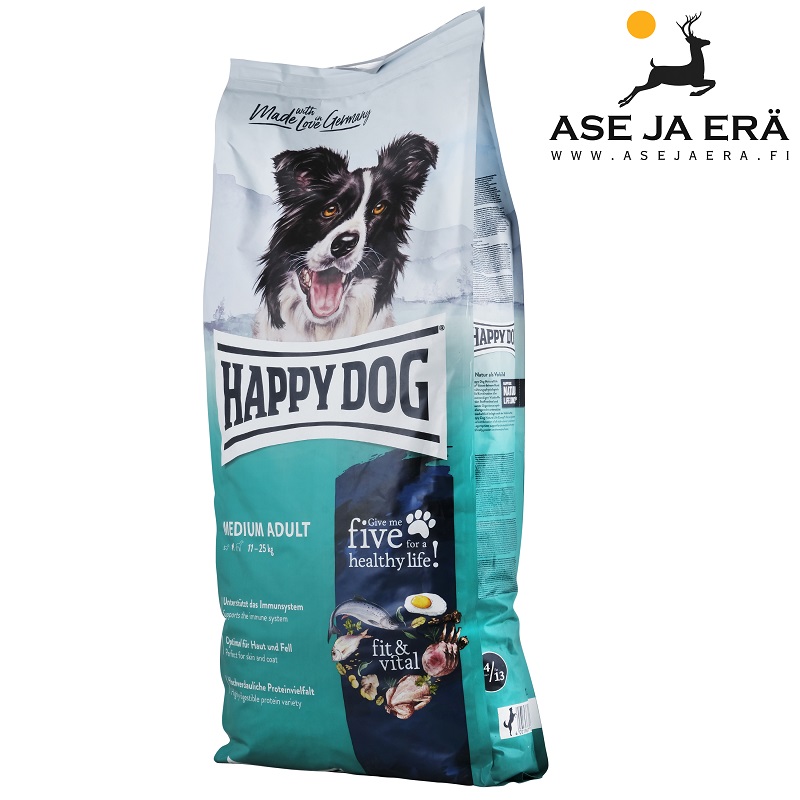 Happy Dog Fit & Vital Adult Medium on kuivaruoka, joka sisältää 24 % erittäin sulavia proteiineja parasta laatua ja sopivat 13 % rasvaa elintärkeine, tyydyttämättömine Omega-3- ja Omega-6-rasvahappoineen laadukkaista eläin- ja kasviperäisistä lähteistä. Erityinen koostumus ja sovitettu puristemuoto sekä ainutlaatuinen Happy Dog Natural Life Concept®, joka koostuu luonnollisista aineksista, soveltuu täydellisesti kaikille 11-25 kg painaville täysikasvuisille koirille. Ruoka tukee koiran immuunijärjestelmää ja on täydellistä koiran iholle ja turkille.