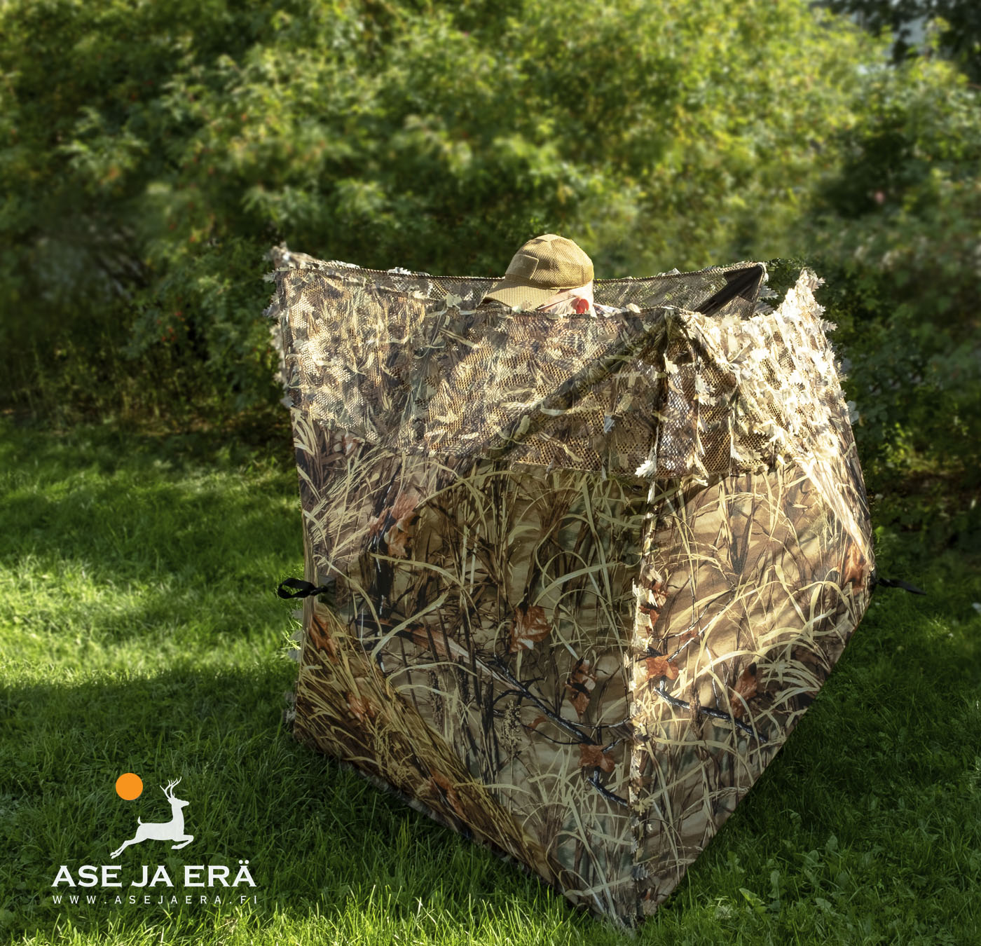 Alces Pop-up -maastopiilo on kolmiseinäinen, nopeasti pystytettävä ja tehokkaasti naamioiva maastopiilo. Maastopiilon yläreunan camo-kuosinen verkko helpottaa ympäristön tarkkailua passista.