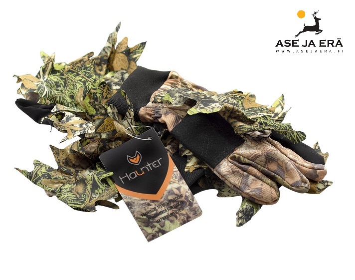 Haunter lehticamo hanskoissa on pehmeä ja mukava 3D-lehticamo, jonka ulkopinta on valmistettu 100% polyesteristä. Hanskat ovat valmistettu myöskin polyesteristä ja niissä on ylimääräiset nahkaiset vahvikkeet peukalossa ja kämmenessä. Hanskoja on saatavilla koossa M ja L.