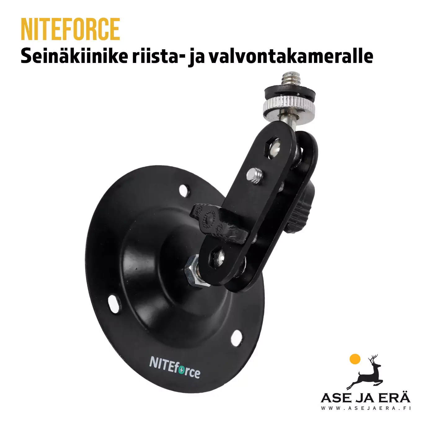 Kiinnike on erityisen hyödyllinen silloin, kun haluat käyttää riistakameraasi valvontakamerana ja kiinnittää sen turvallisesti esimerkiksi kesämökin tai muun kohteen seinään. Niteforce kiinnikkeessä on kaksi pikasäätöistä palloniveltä, joiden ansiosta saat suunnattua ja säädettyä kamerasi juuri haluamaasi kulmaan.