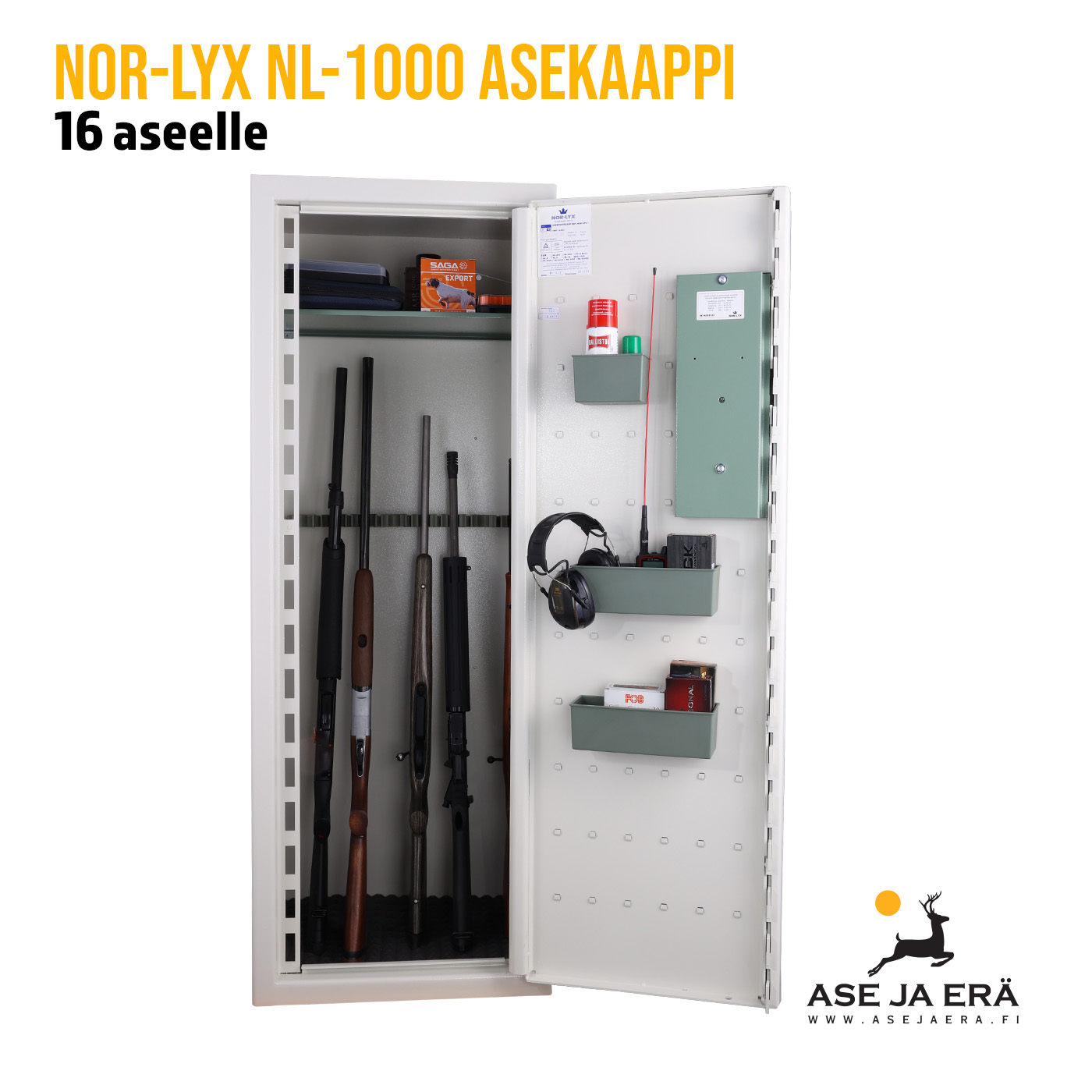 NL-1000-asekaappi on varustettu avainlukolla, johon tulee kaapin mukana 2 avainta. Kaapin sisällä on piipputuki 16 aseelle ja pohjalla on suojaava matto. Kaapin yläosassa on irrotettava ylähylly ja lisäksi ovessa on 3 siirrettävää laatikkohyllyä. Kaikkia Nor-Lyx -lisävarusteita voidaan siirrellä kaapin sisällä tarpeidesi mukaan.