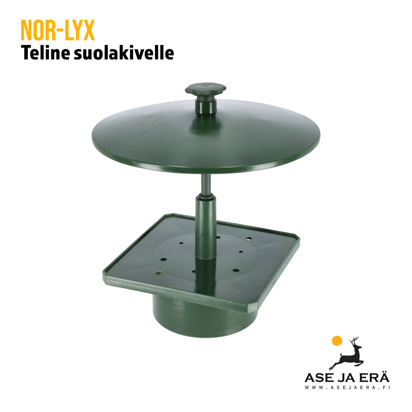 Nor-Lyx telineen pohjassa on reikiä, joista suola pääsee imeytymään puuhun ja valumaan alaspäin pienemmänkin riistan ulottuville.