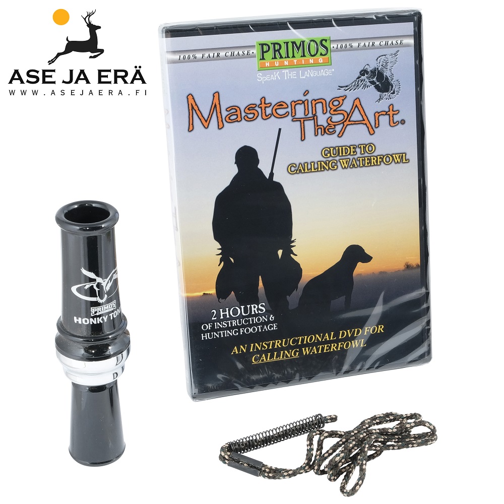 Setti sisältää Mastering the Art Guide to calling Waterfowl -DVD:n sekä Primos Honky Tonk -hanhipillin.