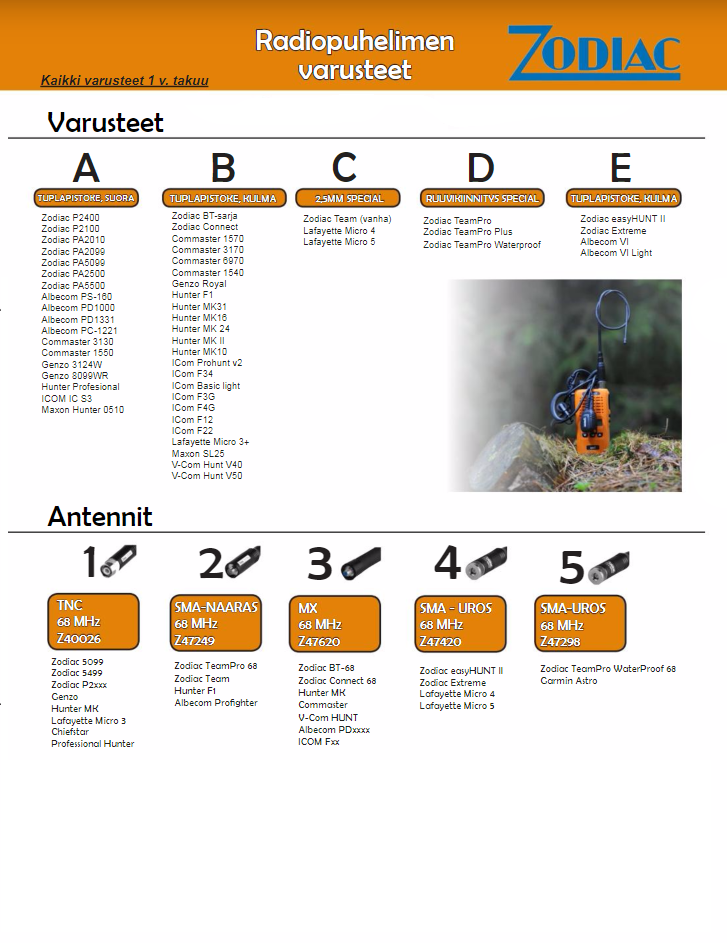 Zodiac korvakuuloke 3,5mm liitännällä. Korvan päälle tuleva Zodiac korvakuuloke on yhteensopiva seuraavien VHF-puhelimien kanssa: