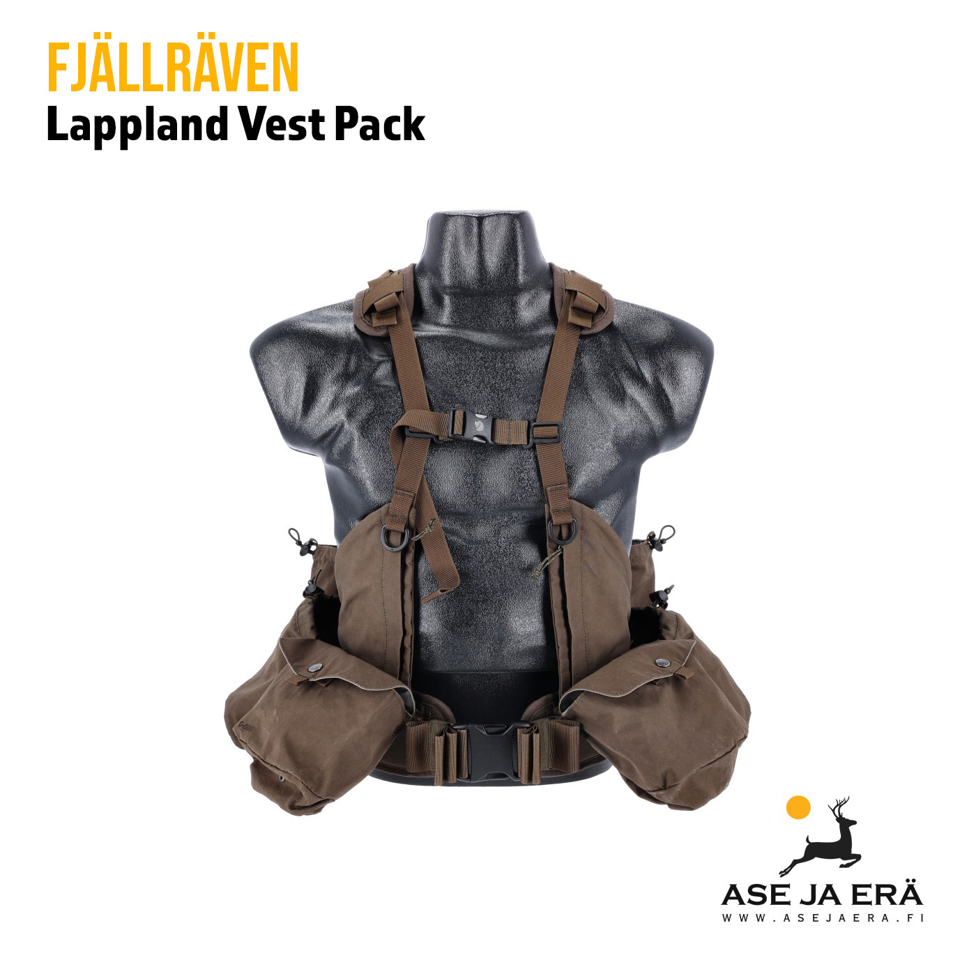 Fjällräven Lappland Vest Pack on monikäyttöinen repullinen varusteliivi aktiiviseen metsästykseen. Reppu tarjoaa optimaalisen ratkaisun metsästäjille, erityisesti koirankouluttajille sekä linnustajille ja se on varustettu useilla tilavilla taskuilla. Etupuolella on pienempiä vetoketjulla suljettavia taskuja pienille tavaroille ja suvulla lantiovyössä on 4 isompaa taskua 2 läpällistä ja kaksi avointa taskua. Repun takana on kaksi isoa varustetaskua. Lantiovyössä ja olkaviilekkeissä on monipuoliset säädöt, jolloin se asettuu mukavasti ja huomaamattomasti selkään. Reppua on miellyttävä kantaa. Lantiovyönsolki on tukeva ja helppokäyttöinen. Olkaviilekkeet ovat suunniteltu siten, etteivät ne häiritse ammuttaessa tai asetta käsitellessä.
