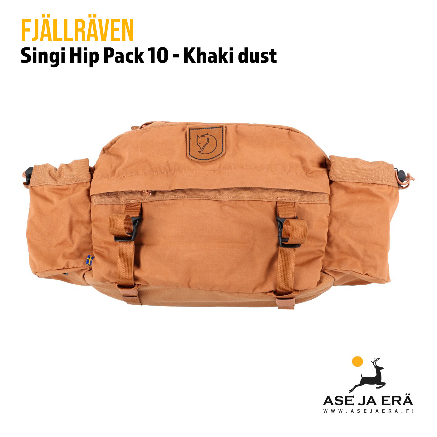 Fjällräven Singi Hip Pack 10 Khaki Dust on vaelluksille, metsästykseen ja vaikka "bushcraftiin" soveltuva toiminnallinen ja suuri vyölaukku. Vyölaukku on valmistettu PFC-yhdisteistä vapaasta, kierrätetystä polyesteri ja puuvilla seoksesta. Monipuolisessa laukussa on 10-litrainen päälokero, pieni päällistasku, etutasku, sivuilla kiristysnyörein suljettavat taskut esim. juomapulloille ja tukevassa lantiovyössä on kaksi taskua ja muovilenkit, joihin voi kiinnittää vaikka koiran talutushihnan. Päällä on vielä Singi Mesh Bag-laukun kiinnittämiseen lenkit(lisävaruste).