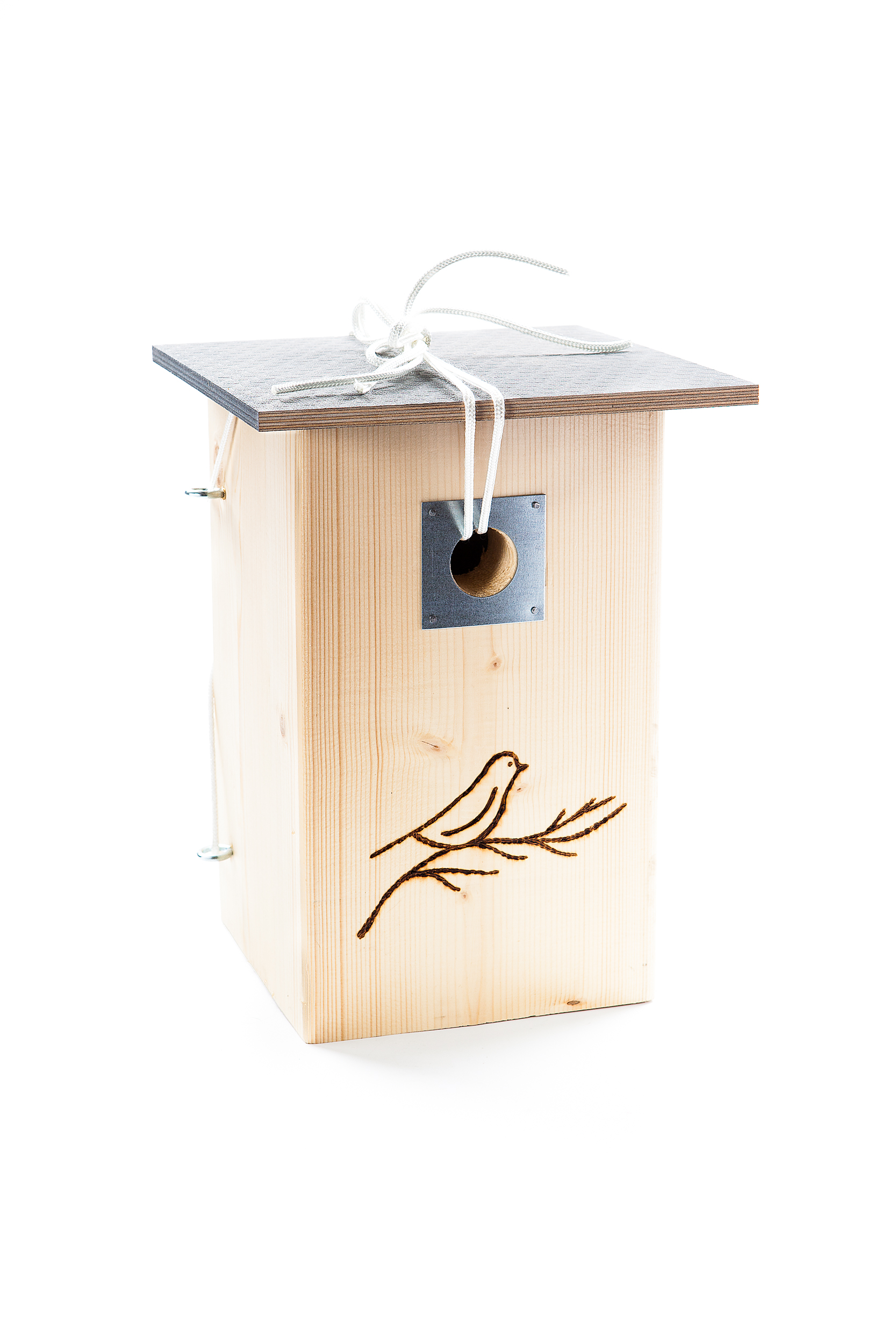 LINTUKOTO lahjamalli, jossa lisäksi polttopiirtämällä tehdyt teksti, kuva tai logo