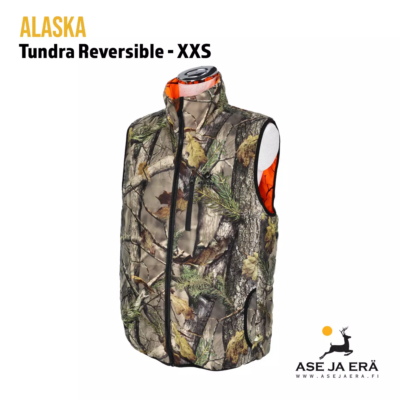 Topatun Alaska Tundra-kääntöliivin toinen puoli on oranssia Blaze 3D -huomiocamoa, joka täyttää metsästyksen turvaväri vaatimukset. Monikäyttöisen liivin toinen puoli taas on tehokkaasti maastouttavaa BlindMax HD -camokuviota.