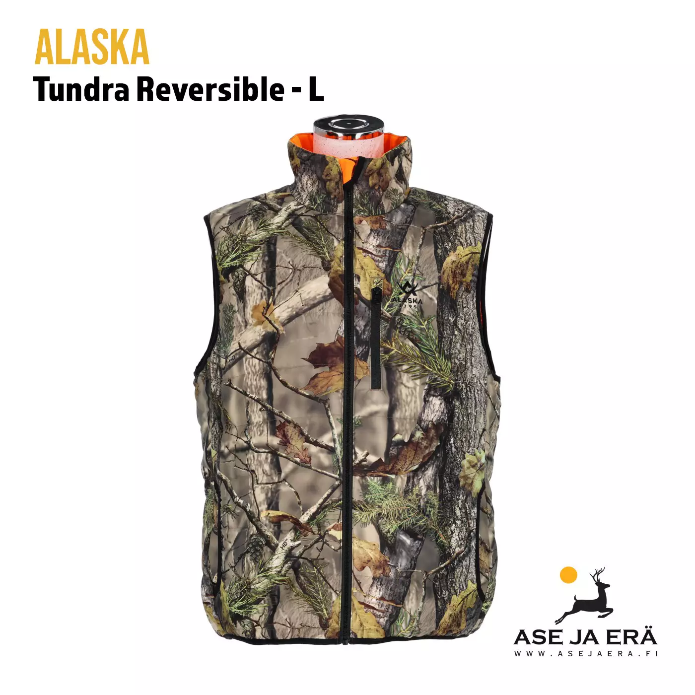 Topatun Alaska Tundra-kääntöliivin toinen puoli on oranssia Blaze 3D -huomiocamoa, joka täyttää metsästyksen turvaväri vaatimukset. Monikäyttöisen liivin toinen puoli taas on tehokkaasti maastouttavaa BlindMax HD -camokuviota.