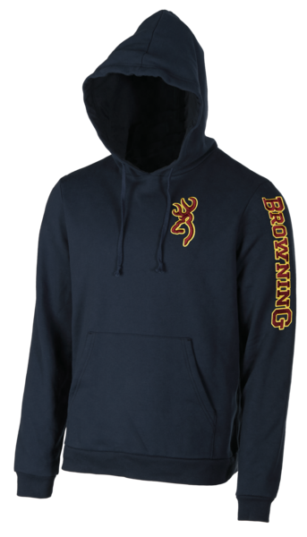 Tummansininen Browningin logolla varustettu Browning Snapshot huppari. Snapshot hupparin lämmöneristysominaisuus on hyvä ja se on myös hiljainen, jonka ansiosta se sopii käytettäväksi hyvin esimerkiksi Browning Snapshot ampumaliivin alla.