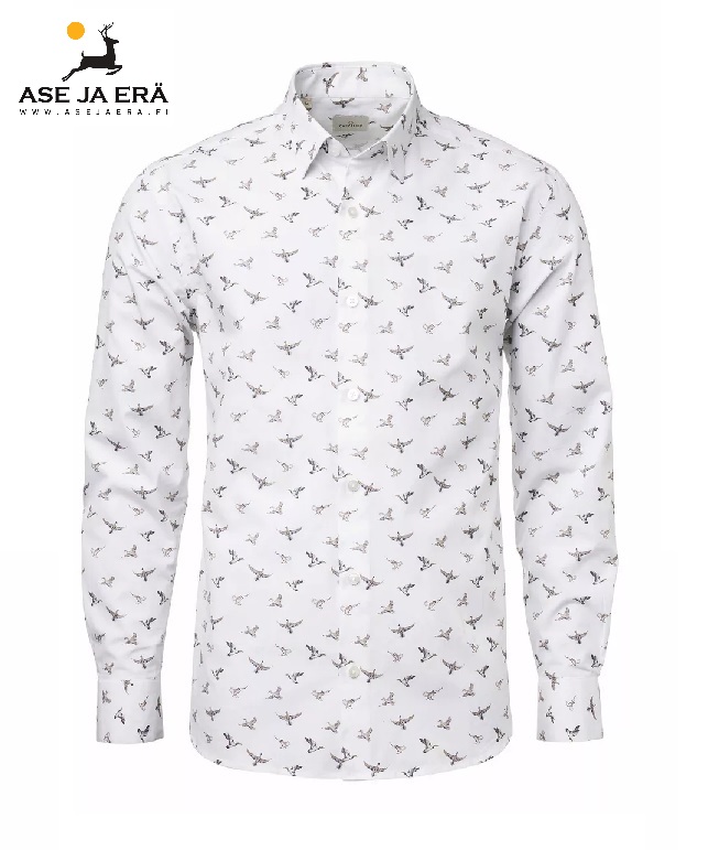 Chevalier Sibbo Flying Ducks -kauluspaita on monipuolinen puuvillapaita, jossa on nappi kauluksen alla ja kuosina lentävät sorsat.