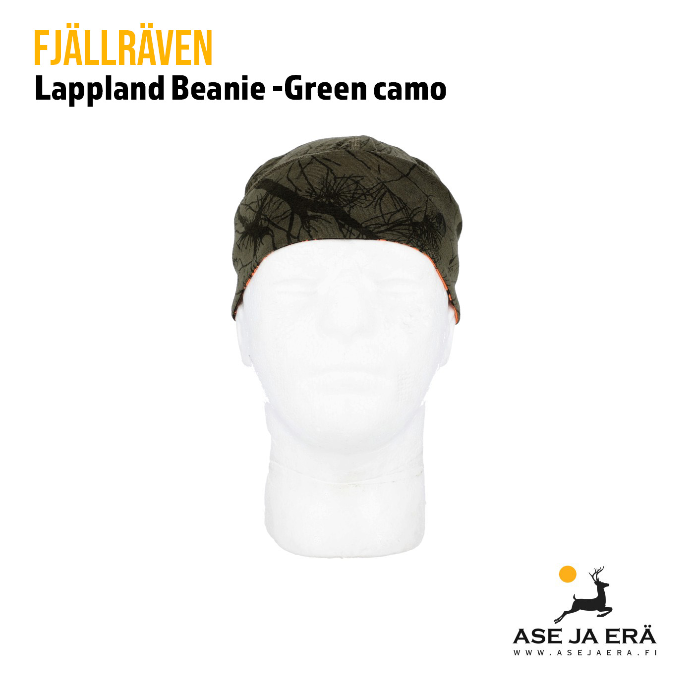 Fjälräven Lappland Beanie on villasta ja polyesterisekoitteesta valmistettu metsästyspipo. Pipo on käännettävä, kaksivärinen oranssilla/vihreällä metsäkuviolla. Hyvin istuva pipo on pieneen tilaan pakkautuva, ohut ja toimii kuulosuojien alla mainiosti.