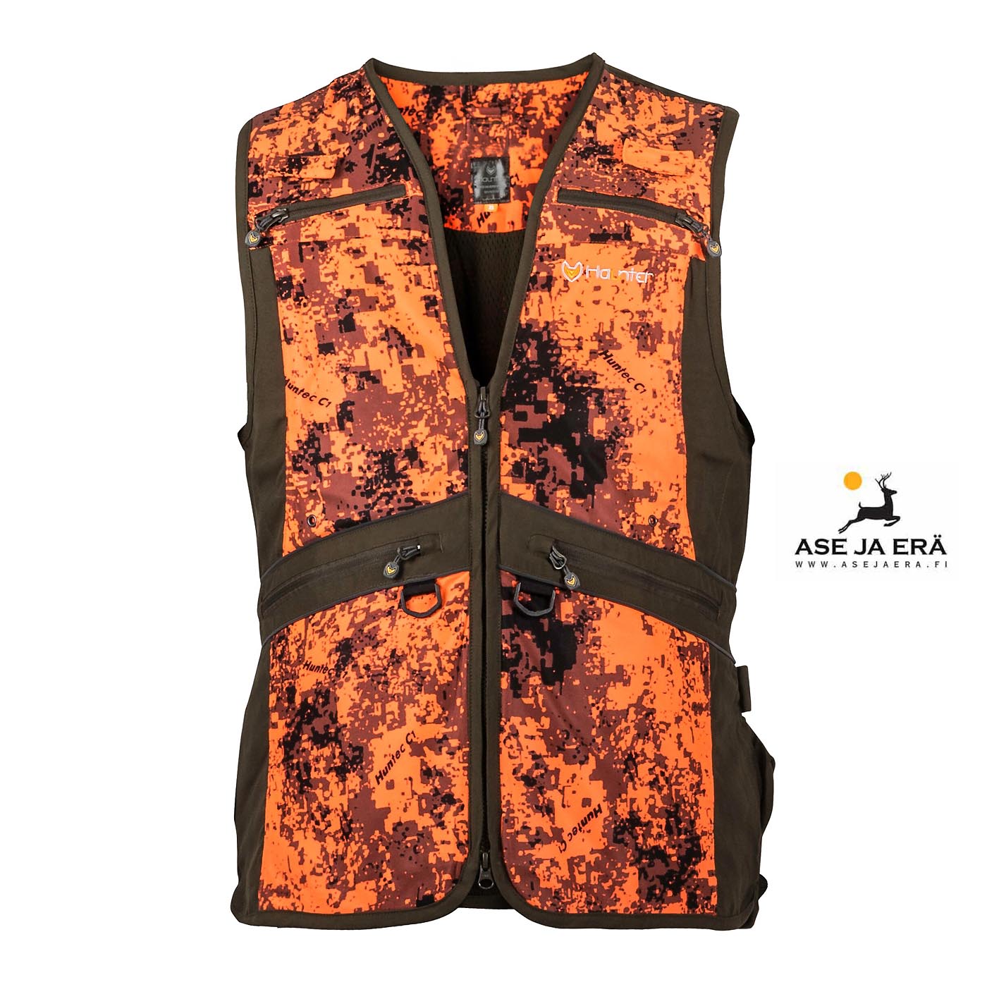 Haunter Choin koiranohjaajan liivi sisältää useamman taskun, reiän kuulokkeiden johtoa varten ja pidikkeen radiota sekä vesipulloa varten. Liivissä on myös tummansävyinen ja huomaamaton heijastin. Liivi on väritykseltään oranssinpunainen camo, joten riistaeläin ei huomaa liiviä, mutta muut metsästäjät näkevät sinut varmasti.